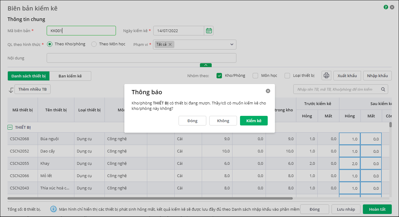 - Trường hợp đang có thiết bị ghi mượn dài hạn, màn hình hiển thị thông báo để cán bộ thiết bị xác nhận tiến hành kiểm kê kho phòng có thiết bị đang mượn.