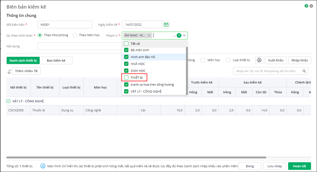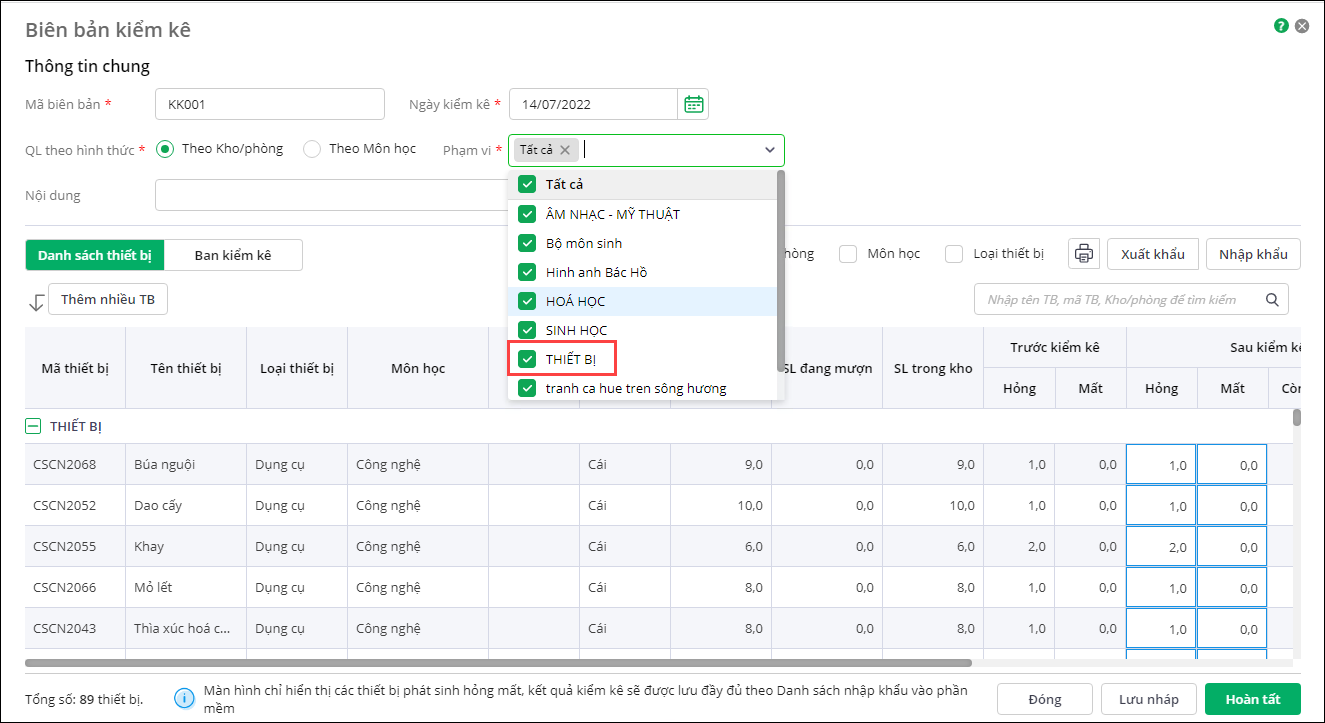 - Trường hợp chọn Kiểm kê: Phần mềm lấy lên danh sách tất cả thiết bị trong kho phòng, kể cả thiết bị đang ghi mượn.