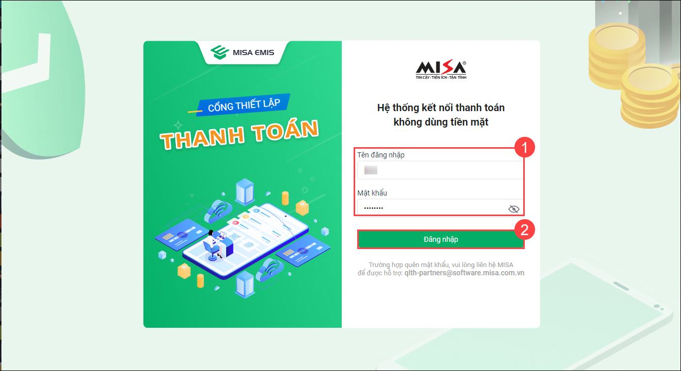 - Sau khi nhận được thông tin tài khoản đăng nhập từ MISA, anh/chị truy cập vào Hệ thống kết nối thanh toán không dùng tiền mặt tại https://emismerchant.misa.vn/login