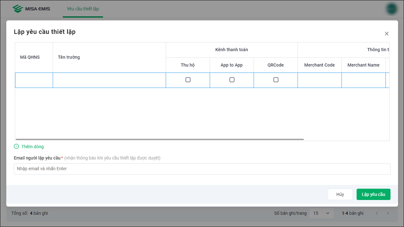Nhấn Thêm dòng để nhập thêm yêu cầu thiết lập cho Nhà trường. Sau khi hoàn tất, nhấn Lập yêu cầu.