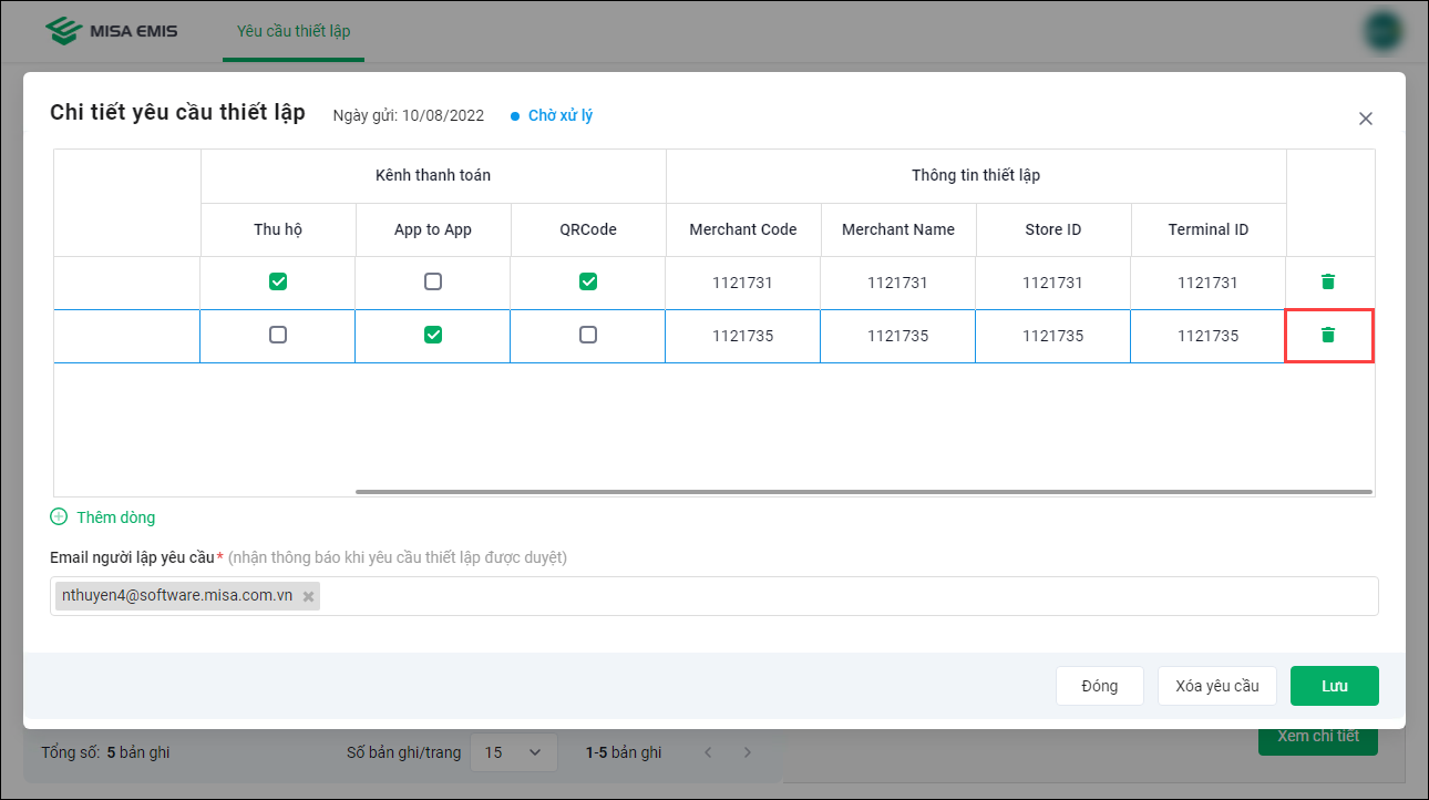 - Anh/chị cũng có thể hủy yêu cầu thiết lập bằng cách cách chọn Xóa yêu cầu và xác nhận xóa cả yêu cầu thiết lập