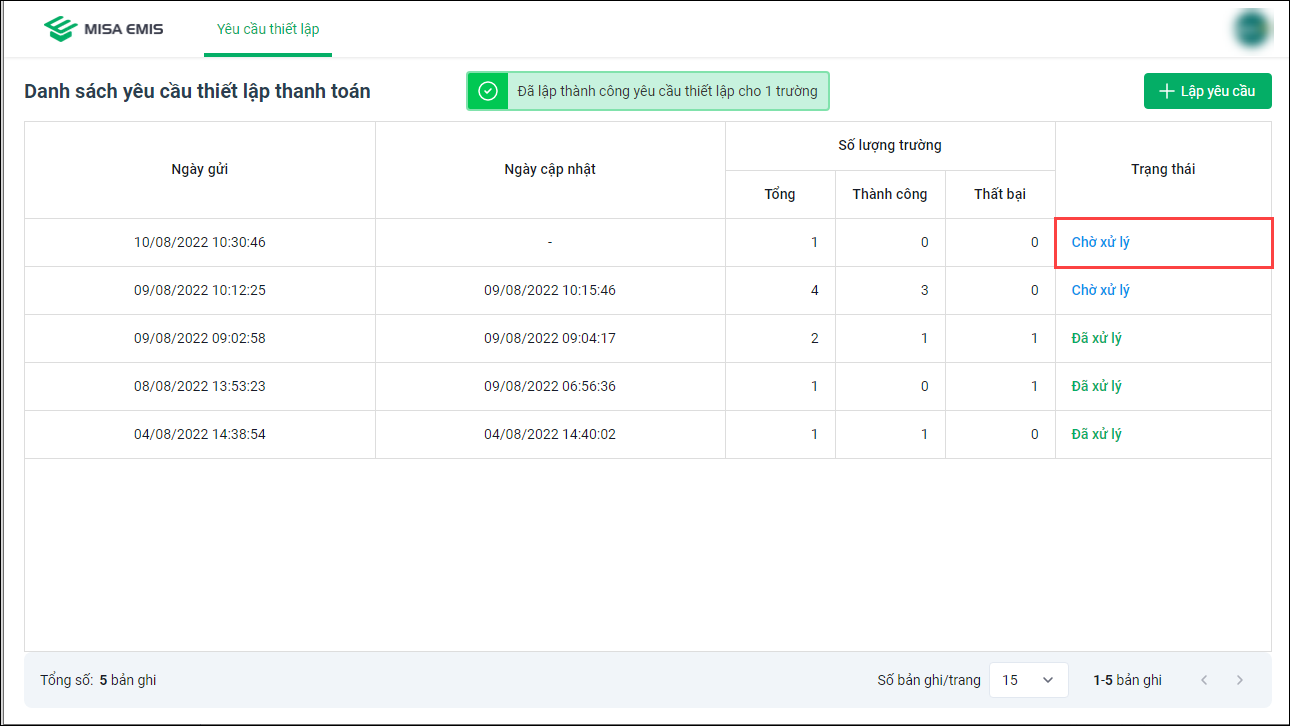 6. Yêu cầu thiết lập sẽ hiển thị trạng thái Chờ xử lý tại Danh sách yêu cầu thiết lập thanh toán. Anh/chị vui lòng đợi đội ngũ MISA phê duyệt yêu cầu và thông báo kết quả qua email.