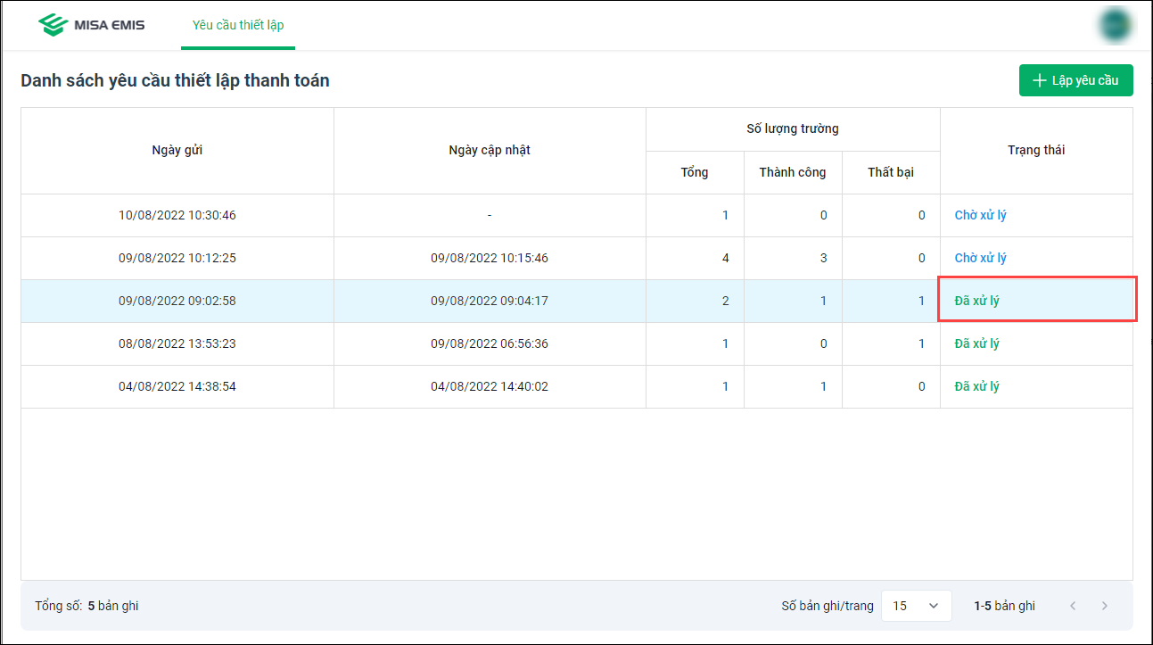 - Tại màn hình danh sách, yêu cầu chuyển sang trạng thái Đã xử lý. Anh/chị xem được số lượng đơn vị đã thiết lập thành công/thất bại.