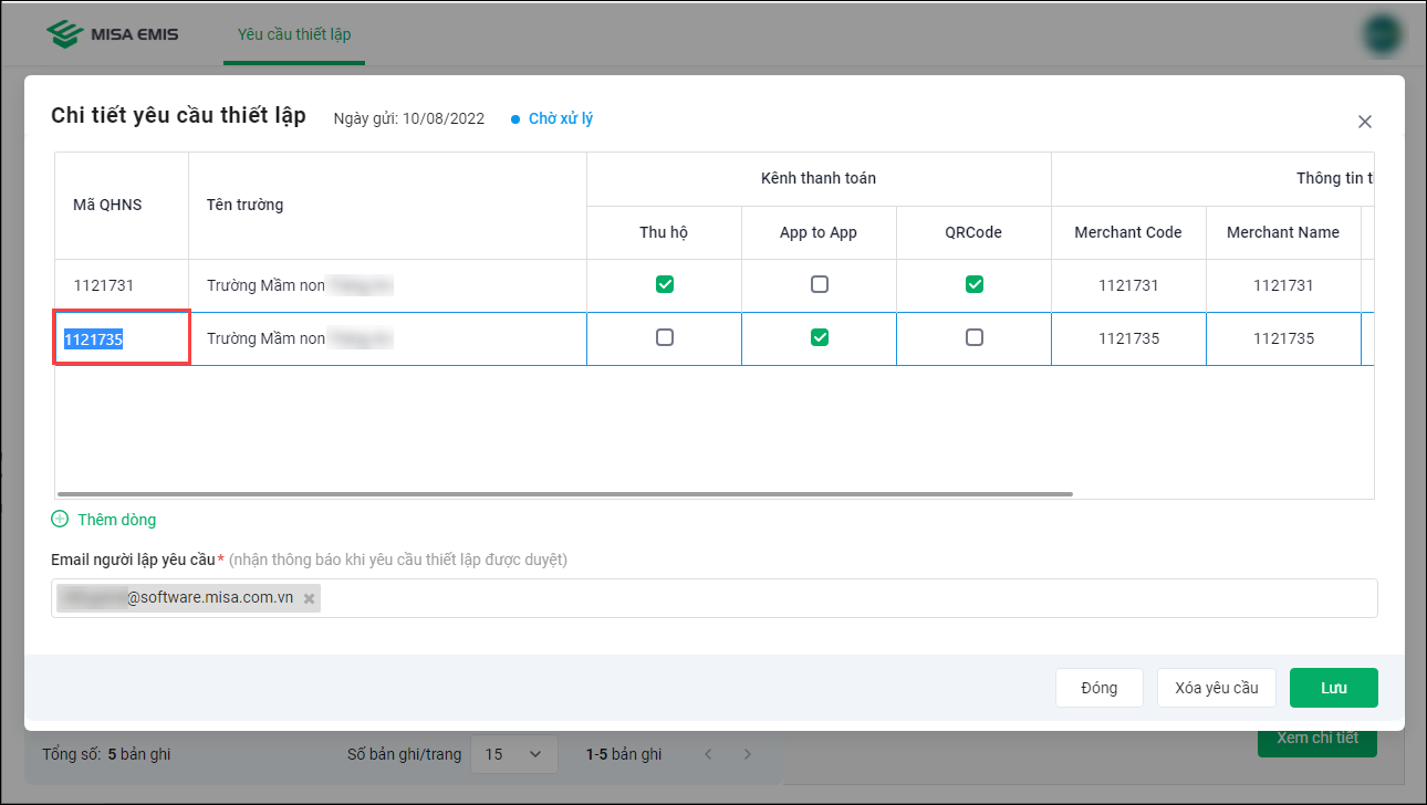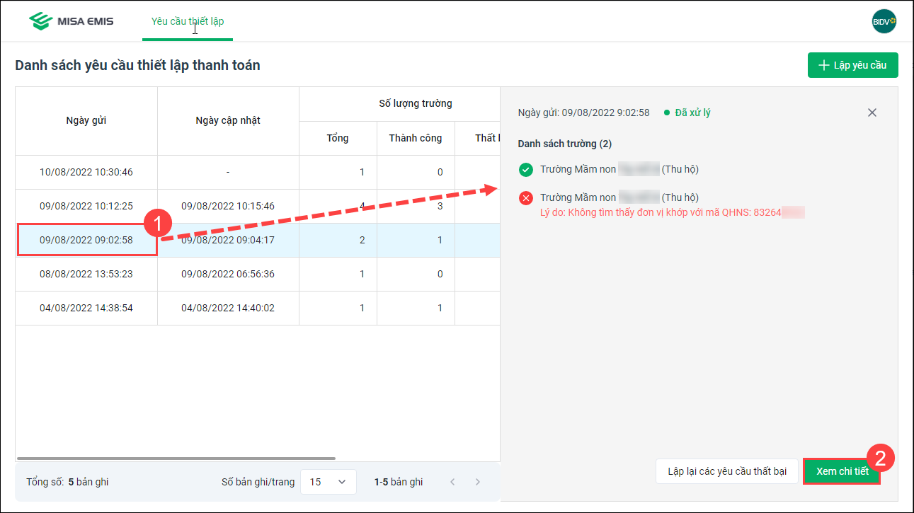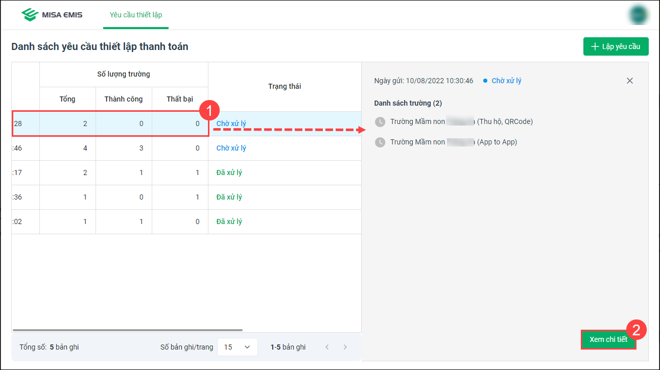 - Tại Danh sách yêu cầu thiết lập thanh toán, nhấn vào yêu cầu thiết lập. Chọn Xem chi tiết.