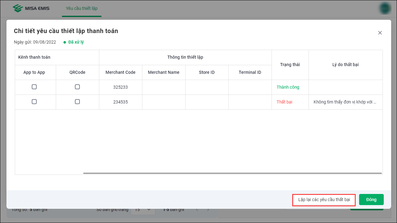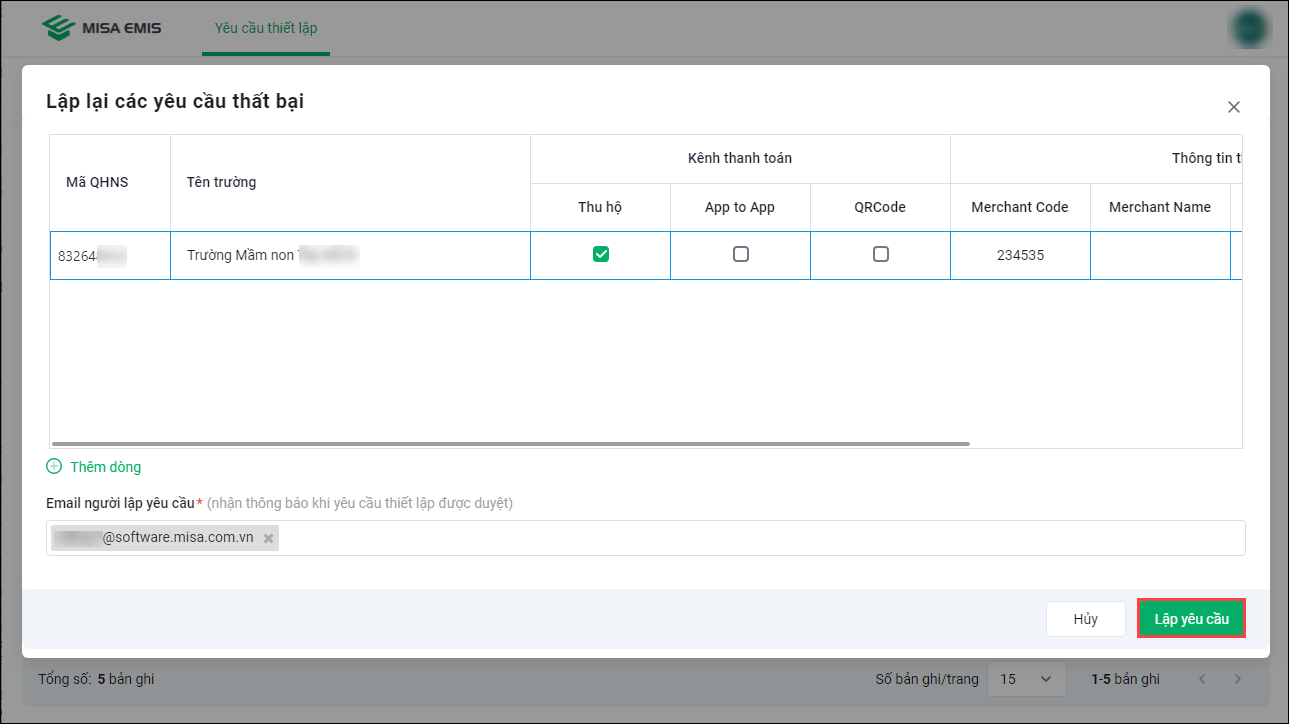 Trường hợp thiết lập thất bại: Anh/chị có thể Lập lại các yêu cầu thất bại để được phê duyệt lại.