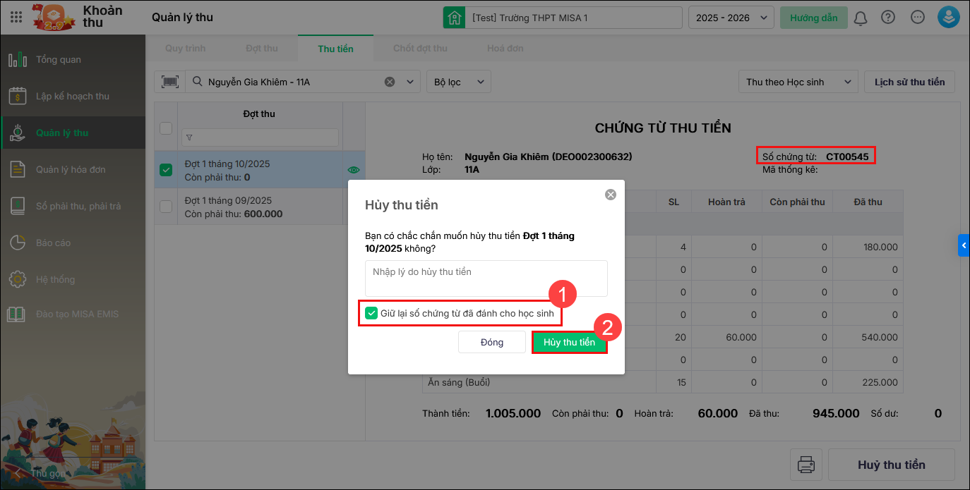 Bước 2: Tích chọn Giữ lại số chứng từ đã đánh cho học sinh. Nhấn Hủy thu tiền.