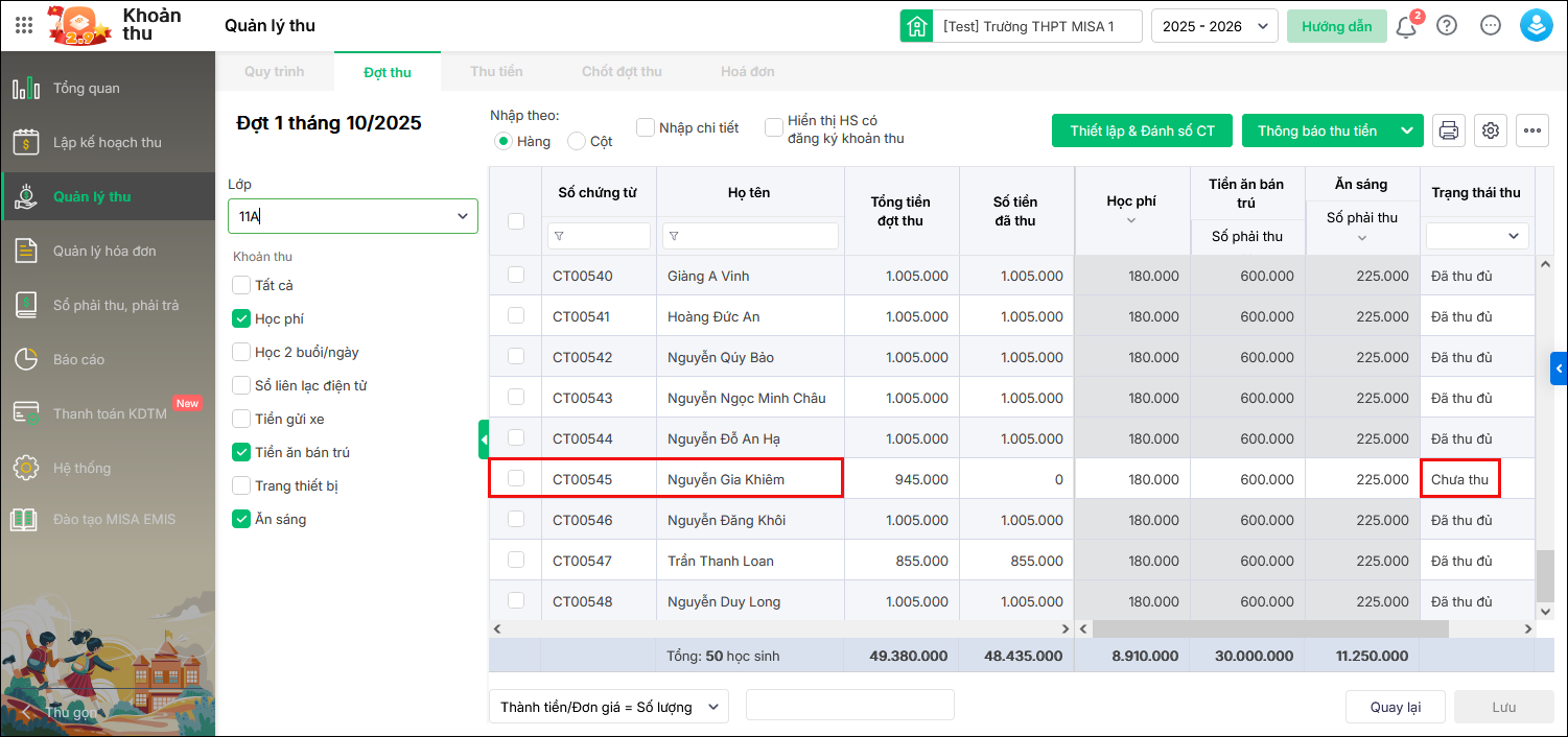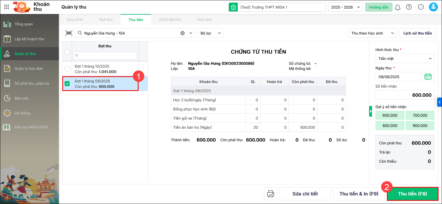 Bước 2: Vào Thu tiền\Thu theo học sinh. Tìm học sinh trong danh sách và chọn đợt thu cần thu tiền, nhấn Thu tiền.