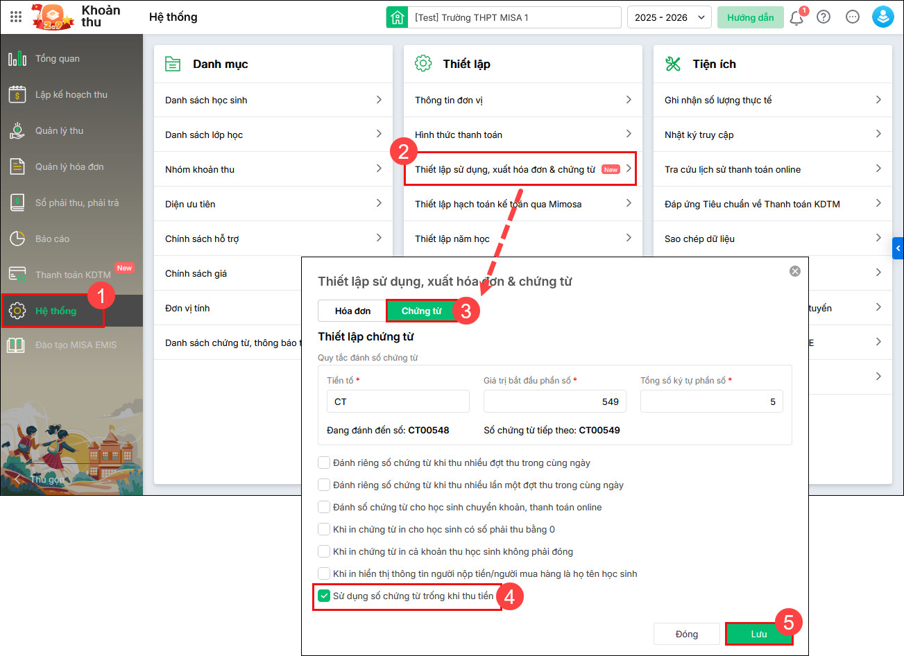 Bước 1: Vào Hệ thống\Thiết lập sử dụng, xuất hóa đơn & chứng từ. Vào mục Chứng từ, tích chọn ô Sử dụng số chứng từ trống khi thu tiền, nhấn Lưu