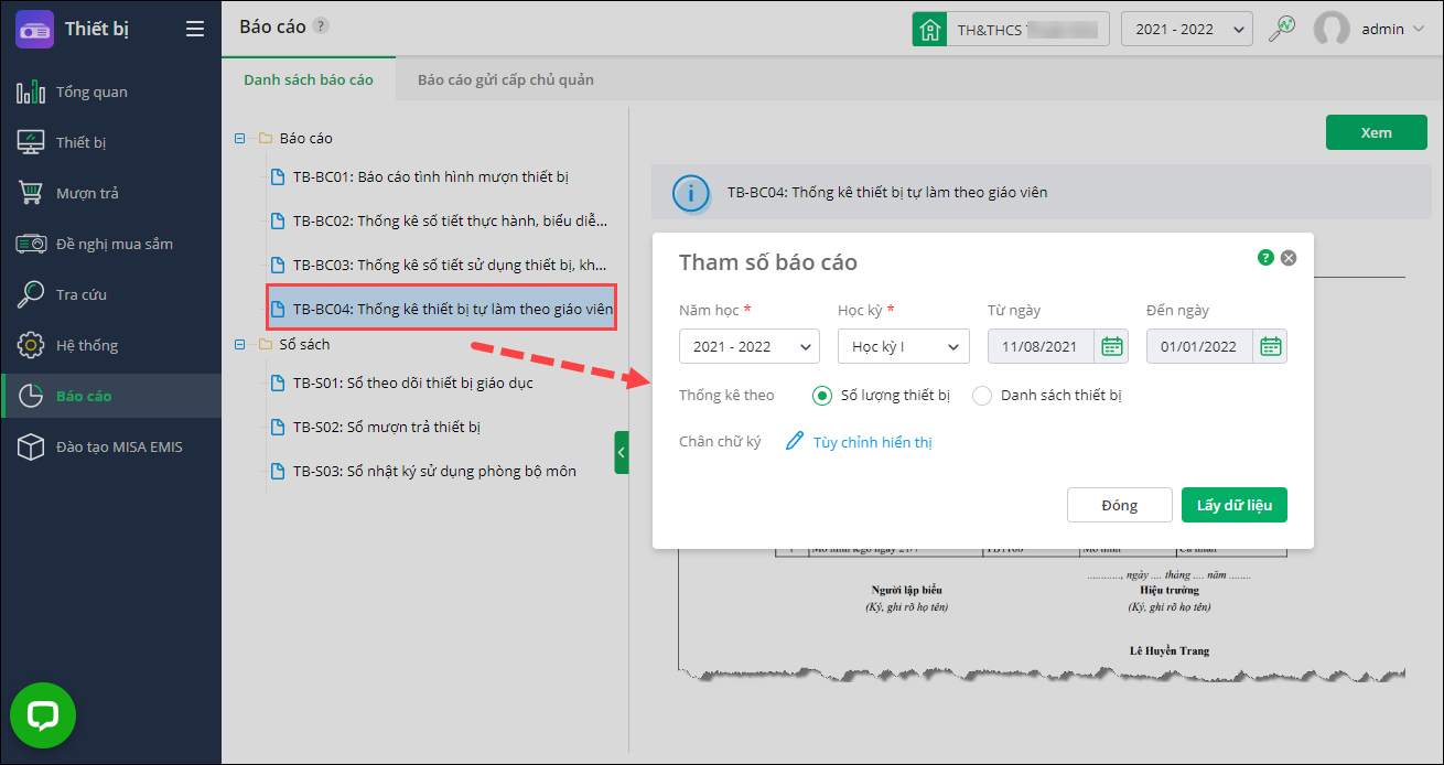 - Vào Thiết bị\Báo cáo, chọn TB-BC04: Thống kê thiết bị tự làm theo giáo viên. Nhấn đúp chuột vào báo cáo hoặc chọn báo cáo trên danh sách, nhấn Xem.