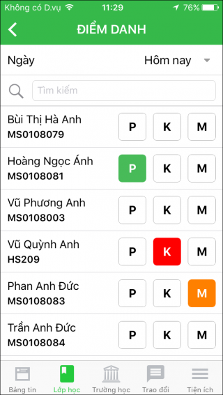 4. Chọn trạng thái điểm danh tương ứng với từng học sinh: P (phép), K (Không phép), M(Muộn).