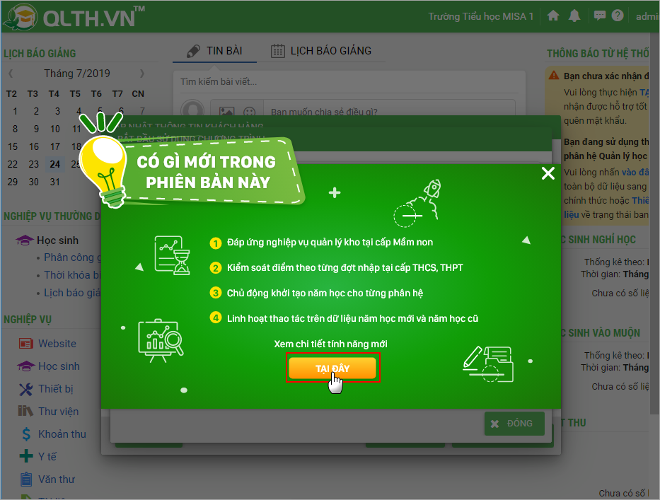 - Đăng nhập vào phần mềm, anh/chị sẽ thấy được các tính năng mới phát triển của phần mềm.