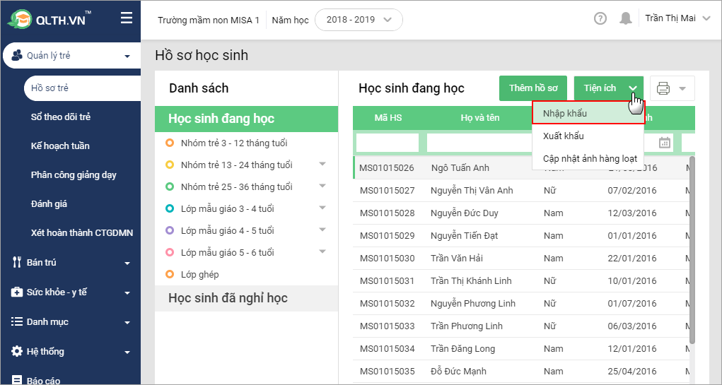 - Vào menu Quản lý trẻ\Hồ sơ trẻ