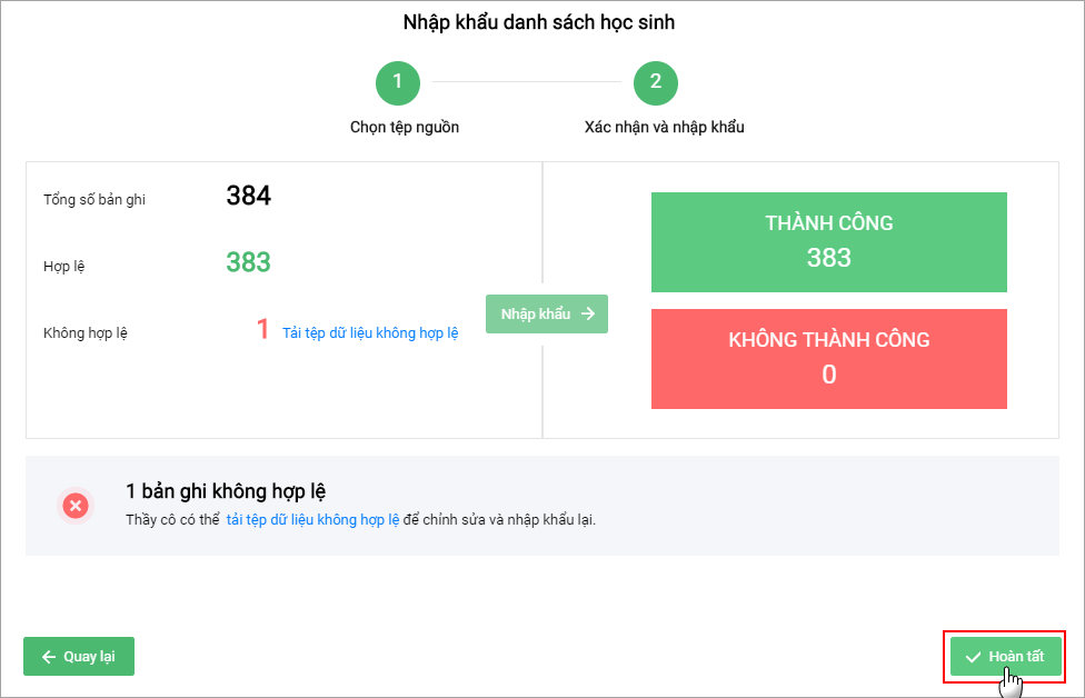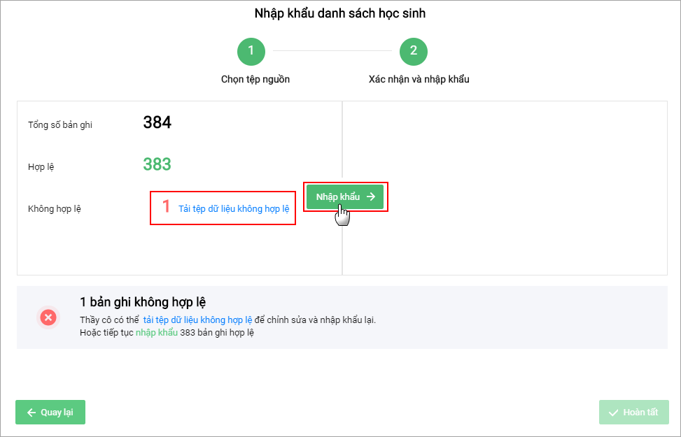 Tại Bước 2: Xác nhận và nhập khẩu, hệ thống sẽ chỉ ra bao nhiêu dữ liệu học sinh hợp lệ, bao nhiêu dữ liệu học sinh không hợp lệ.