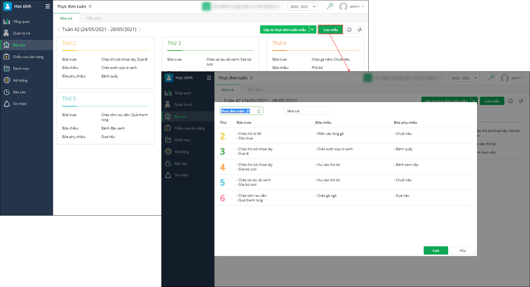 2. Để lưu thực đơn tuần thành thực đơn tuần mẫu để áp dụng cho các tuần khác anh/chị thực hiện như sau