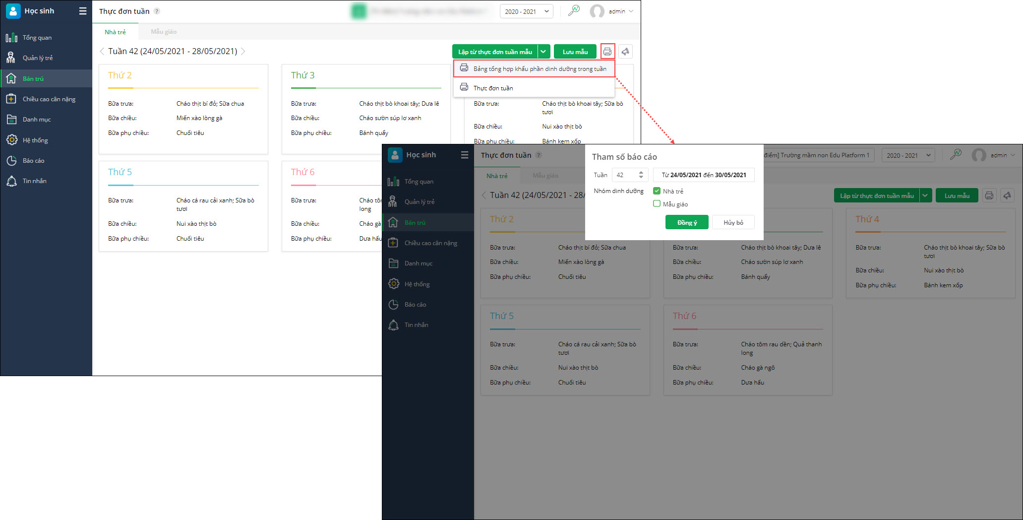 3. Trên Thực đơn tuần chương trình cho phép in Thực đơn tuần hoặc Bảng tổng hợp khẩu phần dinh dưỡng. Để in báo cáo này anh/chị nhấn Biểu tượng máy in và chọn mẫu cần in.