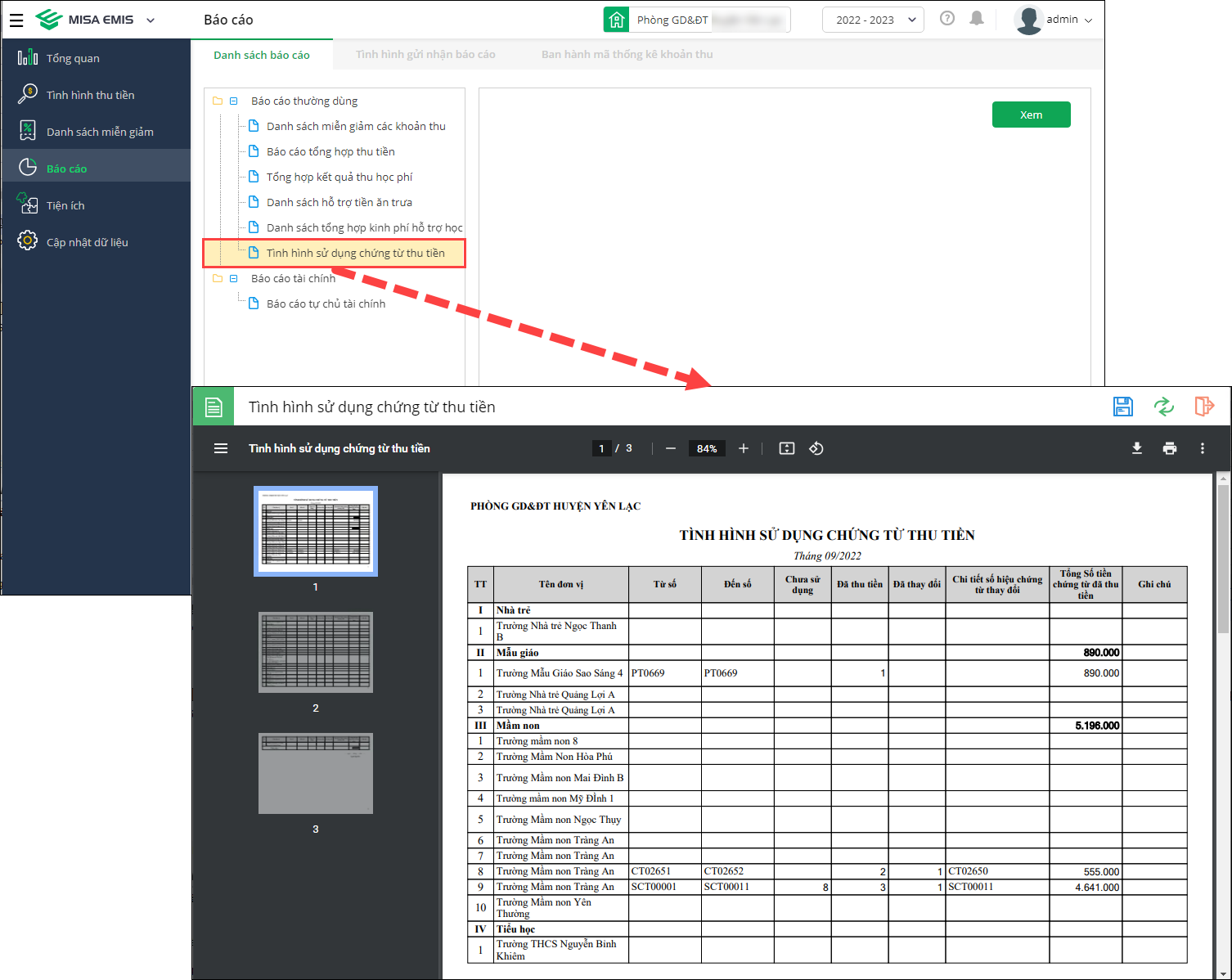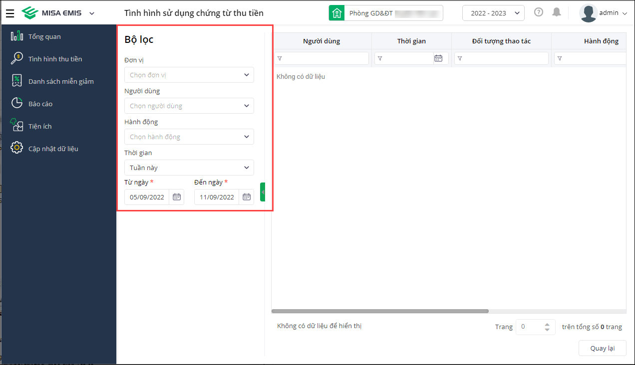 - Phòng Tài chính có thể tự tổng hợp tình hình sử dụng chứng từ thu tiền của các đơn vị trực thuộc.