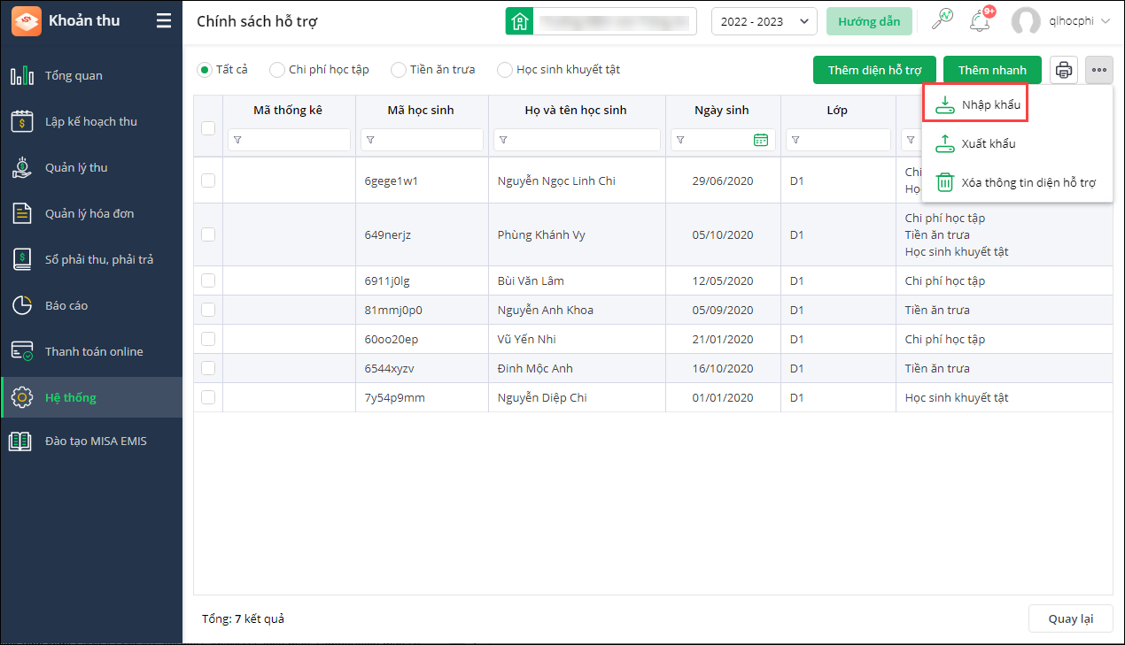 - Kế toán bổ sung nhanh hàng loạt học sinh thuộc diện được hỗ trợ bằng cách Nhập khẩu danh sách.