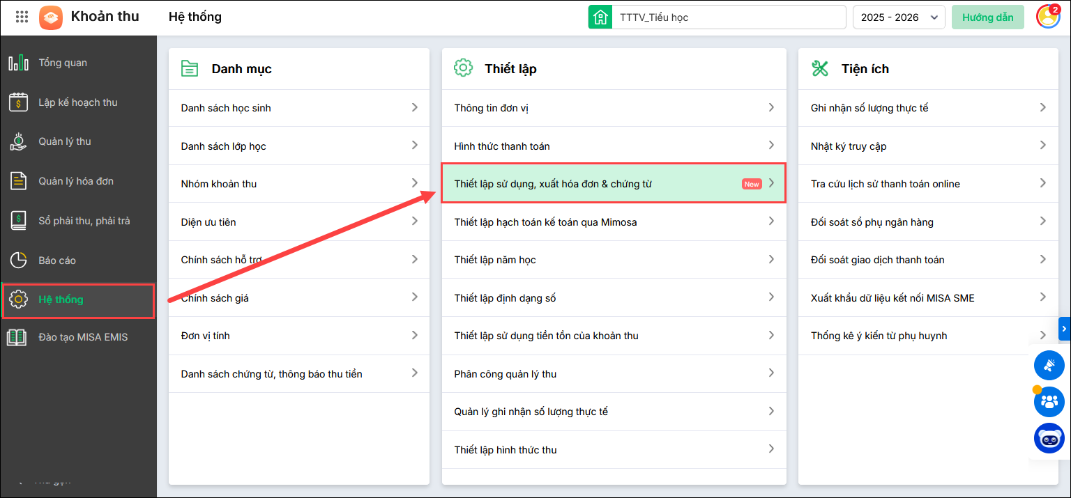 2. Tại năm học mới, bạn vào Hệ thống\Thiết lập sử dụng hóa đơn, chứng từ.