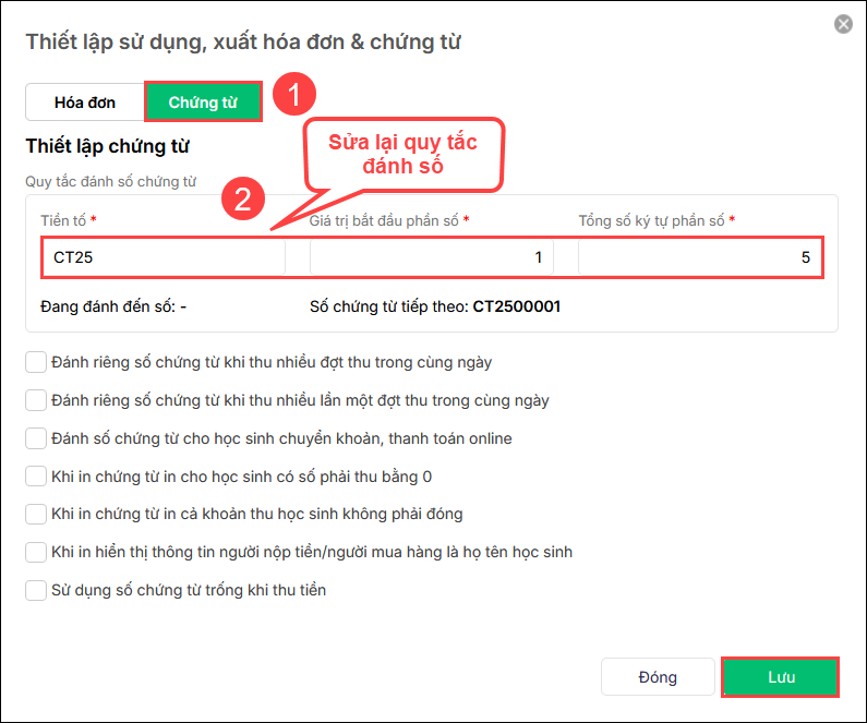 - Bạn muốn đặt (thiết lập) lại số chứng từ từ 1 cho năm học mới, bạn có thể đặt lại tiền tố chứng từ để phân biệt giữa các năm.