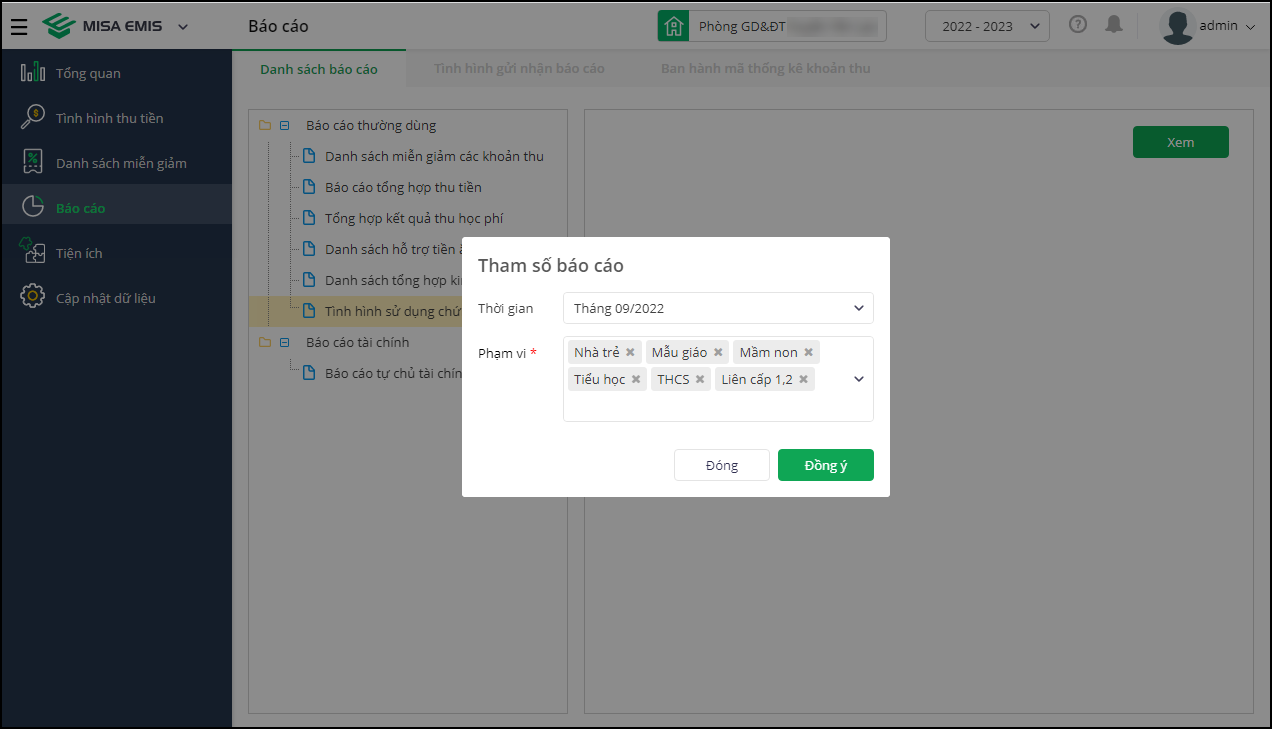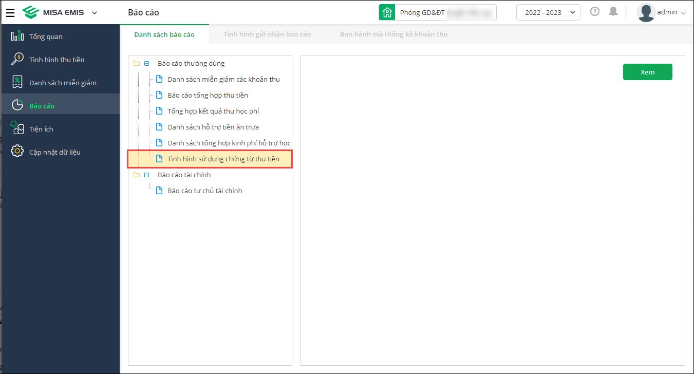 - Cán bộ Phòng Tài chính vào Báo cáo\Danh sách báo cáo, chọn Tình hình sử dụng chứng từ thu tiền.