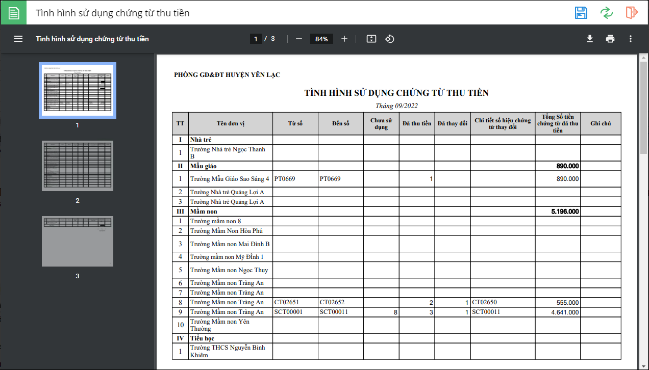3. Nhấn Đồng ý, phần mềm trả về báo cáo tình hình sử dụng chứng từ thu tiền của các đơn vị theo tham số đã khai báo.