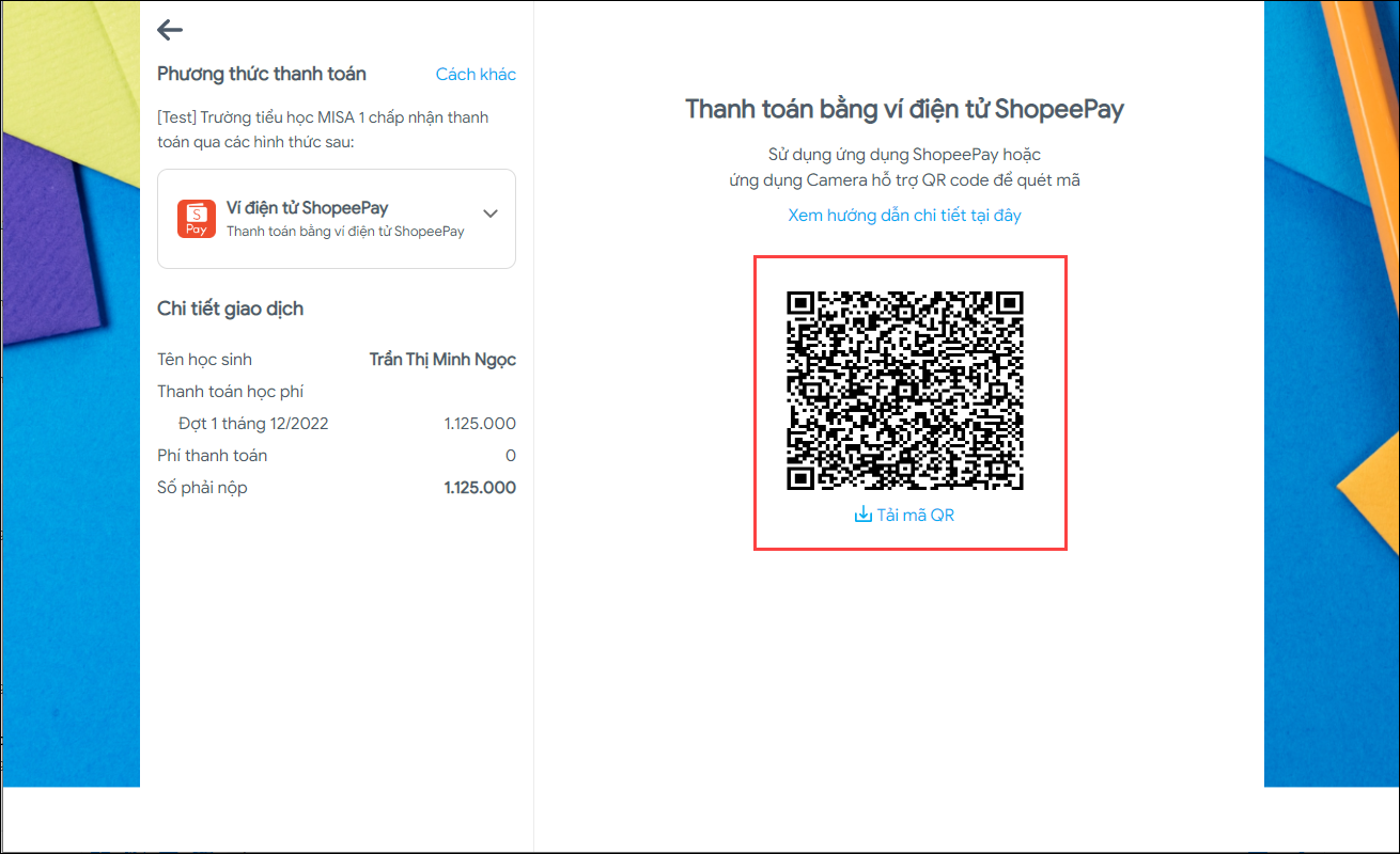 - Khi phụ huynh thanh toán trên máy tính, phần mềm hiển thị mã QR để phụ huynh quét trên ứng dụng ShopeePay.