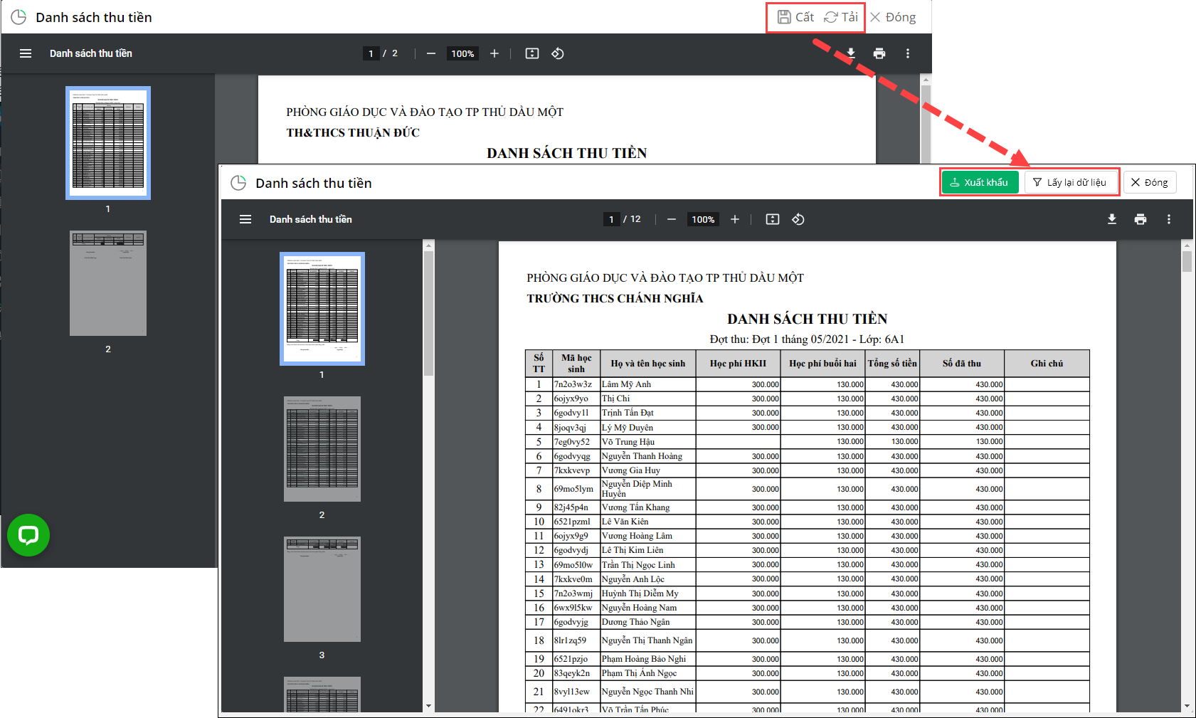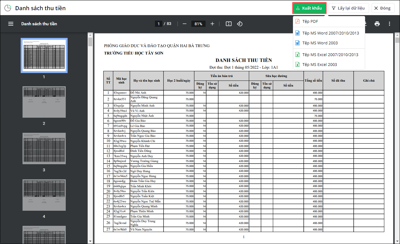 - Khi chọn Xuất khẩu có thể tùy chọn tải file về máy dưới nhiều định dạng: PDF, Excel, Word.