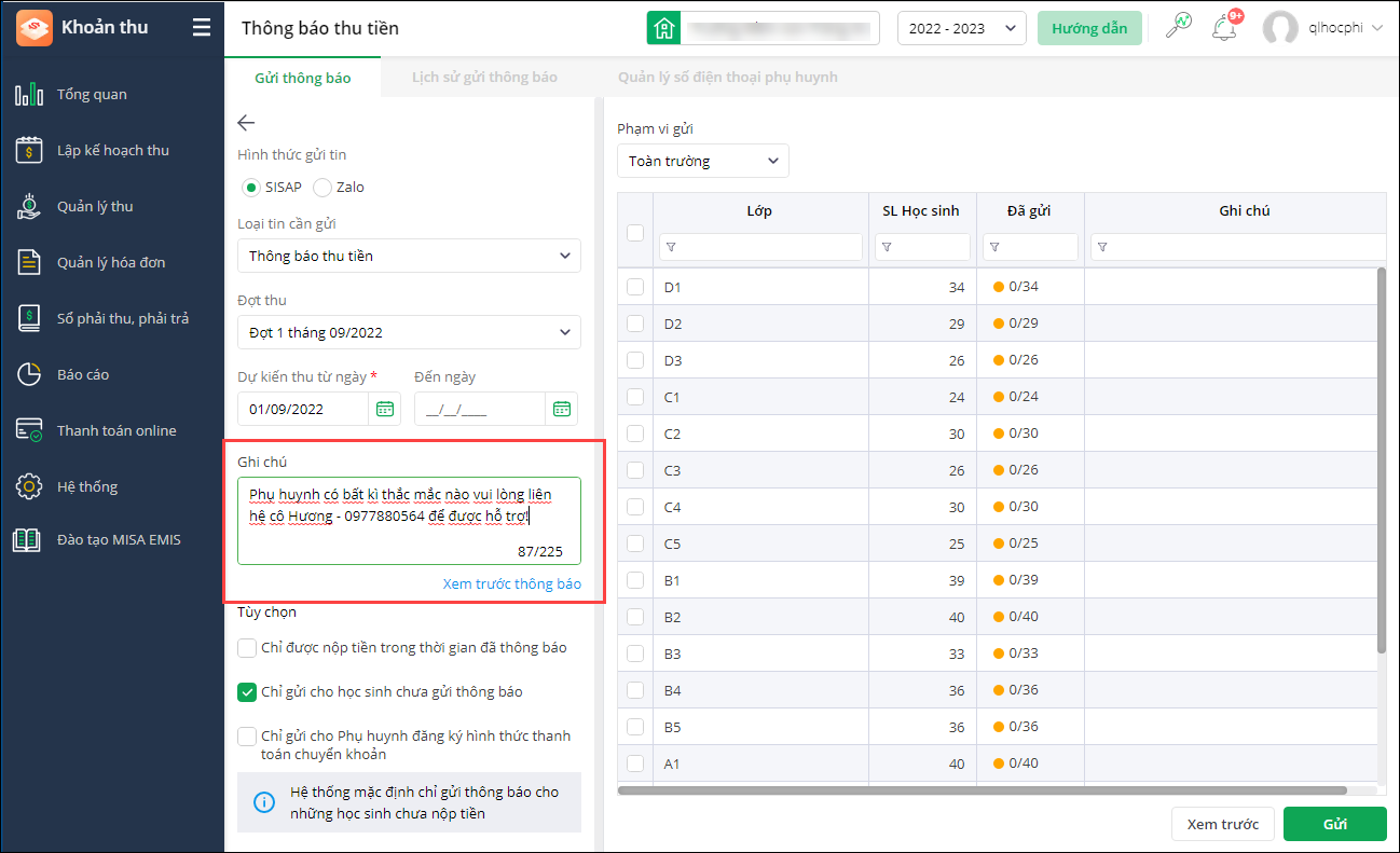 - Nhà trường có thể gửi kèm ghi chú, dặn dò khi gửi thông báo thu tiền cho phụ huynh qua SISAP.