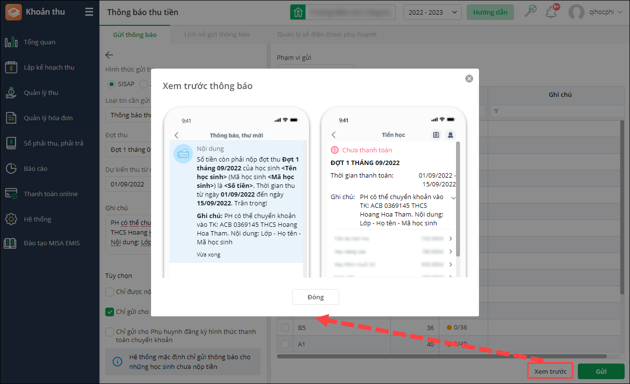 - Chọn Xem trước để xem thông báo trước khi gửi cho phụ huynh.
