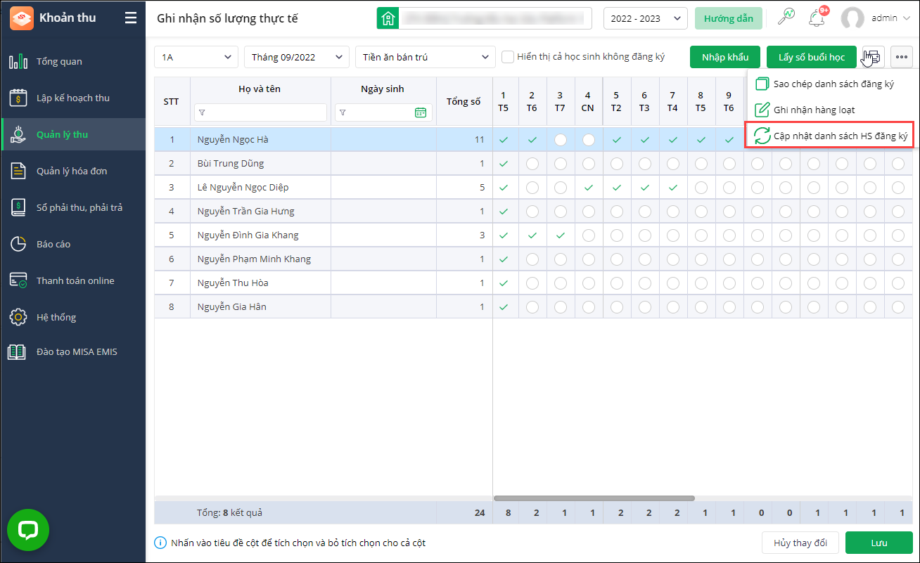 - Tại màn hình Ghi nhận số lượng thực tế, bổ sung tính năng Cập nhật danh sách HS đăng ký để cập nhật danh sách học sinh theo đăng ký khoản thu mới nhất.