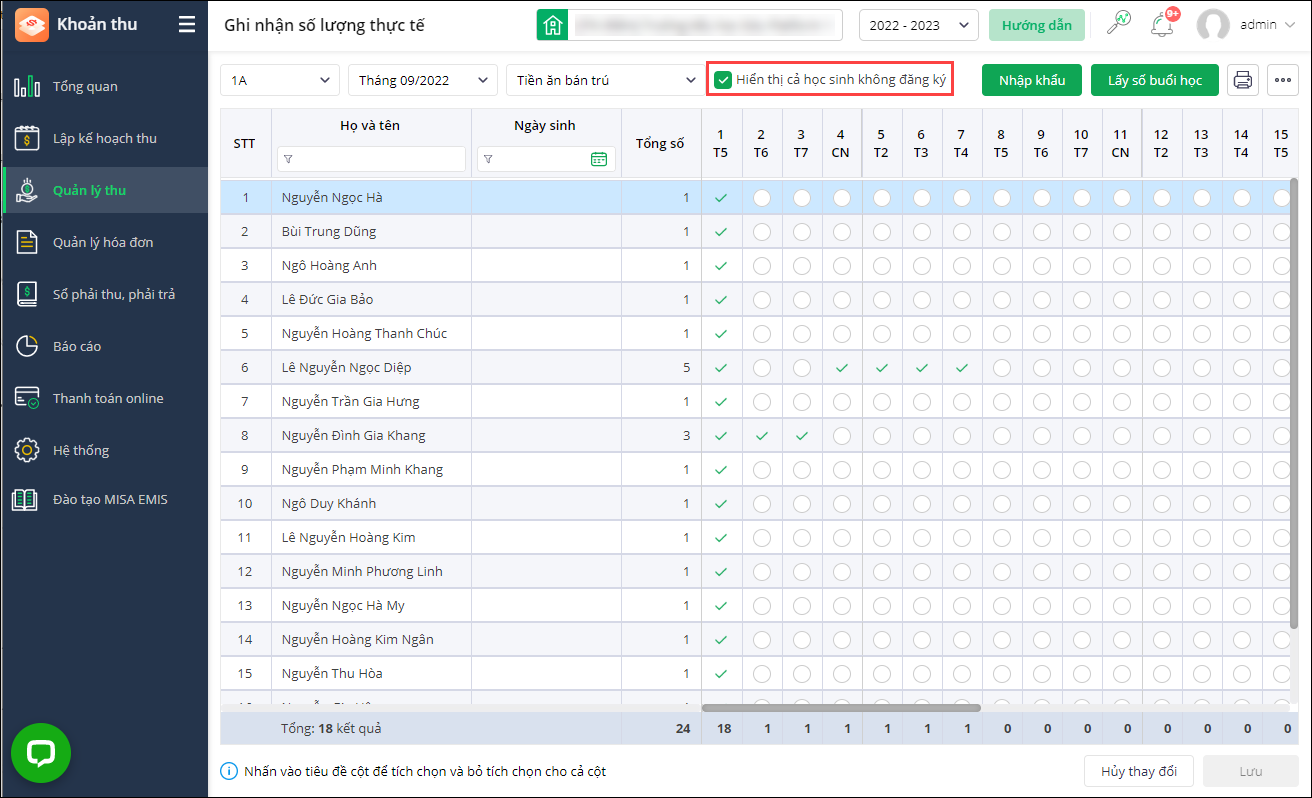 - Kế toán sau khi hủy đăng ký ăn bán trú cho 3 học sinh này trước khi lập đợt thu tháng 6 thì trên màn hình Ghi nhận số lượng thực tế của tháng 5 và các tháng trước đó hiển thị những học sinh đó chưa đăng ký nên không đúng với thực tế ghi nhận.