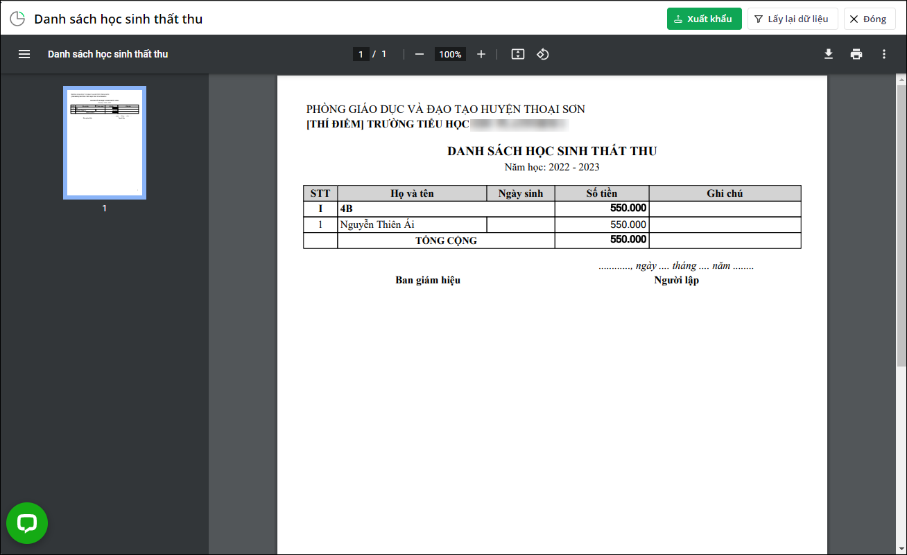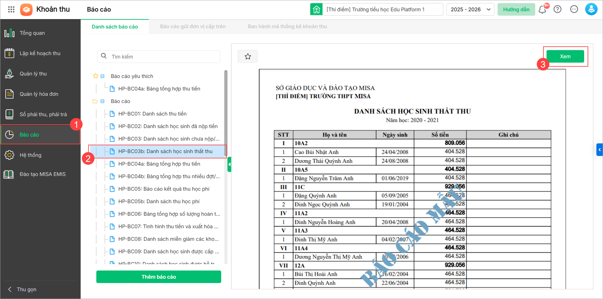 2. [EMIS Khoản thu] HP-BC03b: Danh sách học sinh thất thu