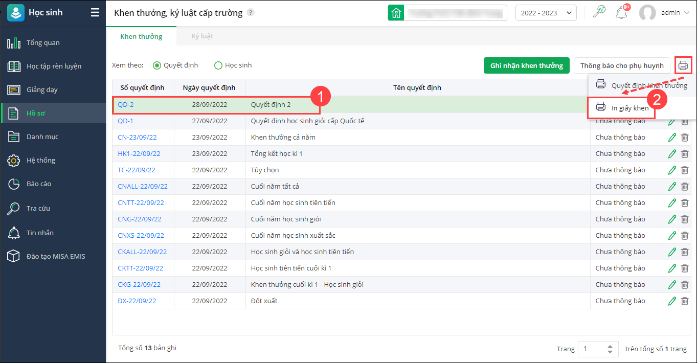 Khi nhà trường có quyết định khen thưởng cá nhân/tập thể tại đơn vị, anh/chị có thể tiến hành in giấy khen như sau: