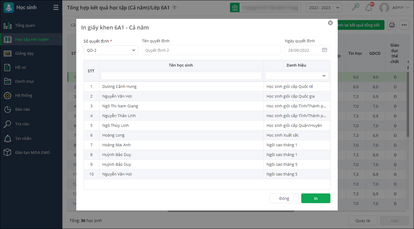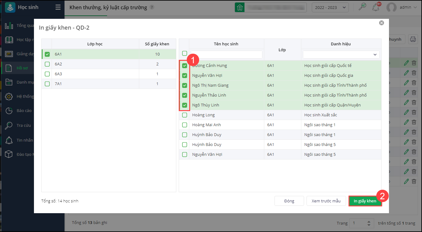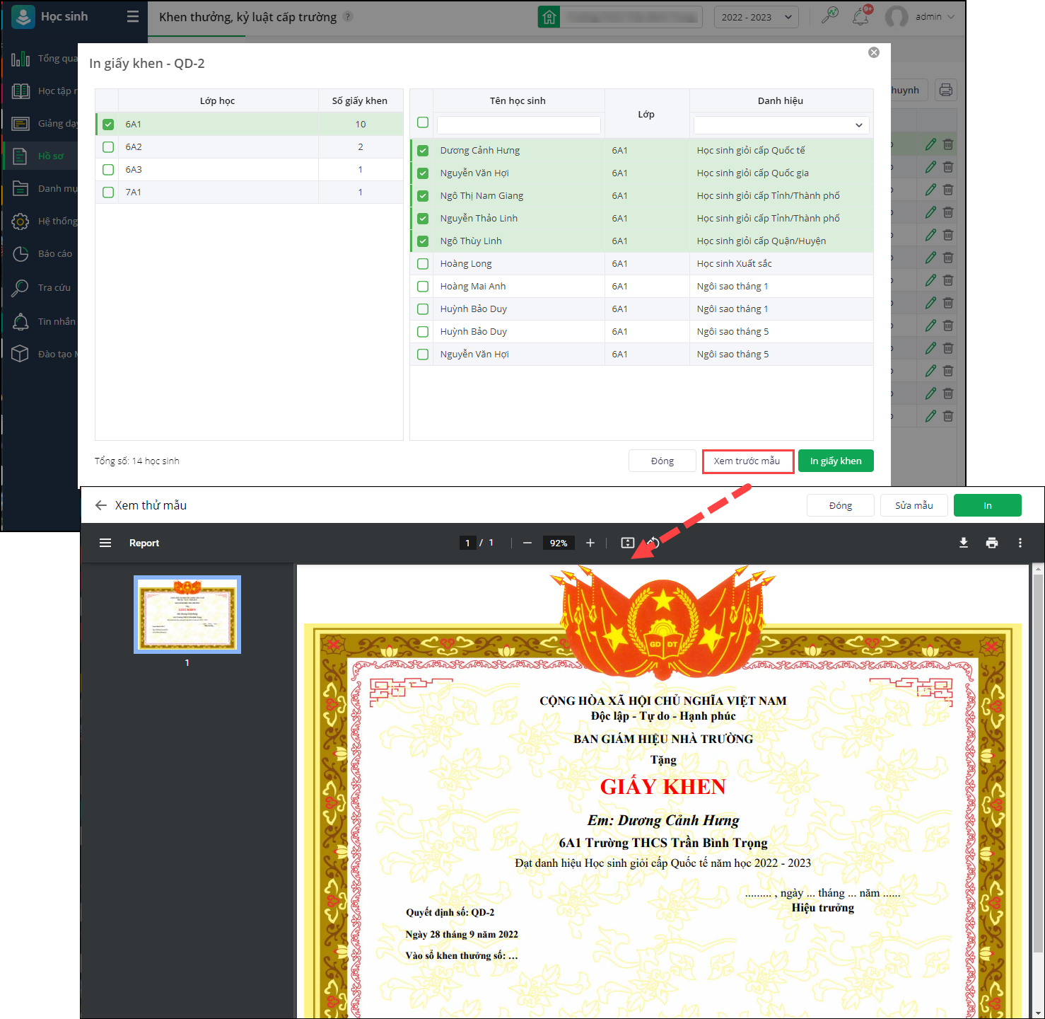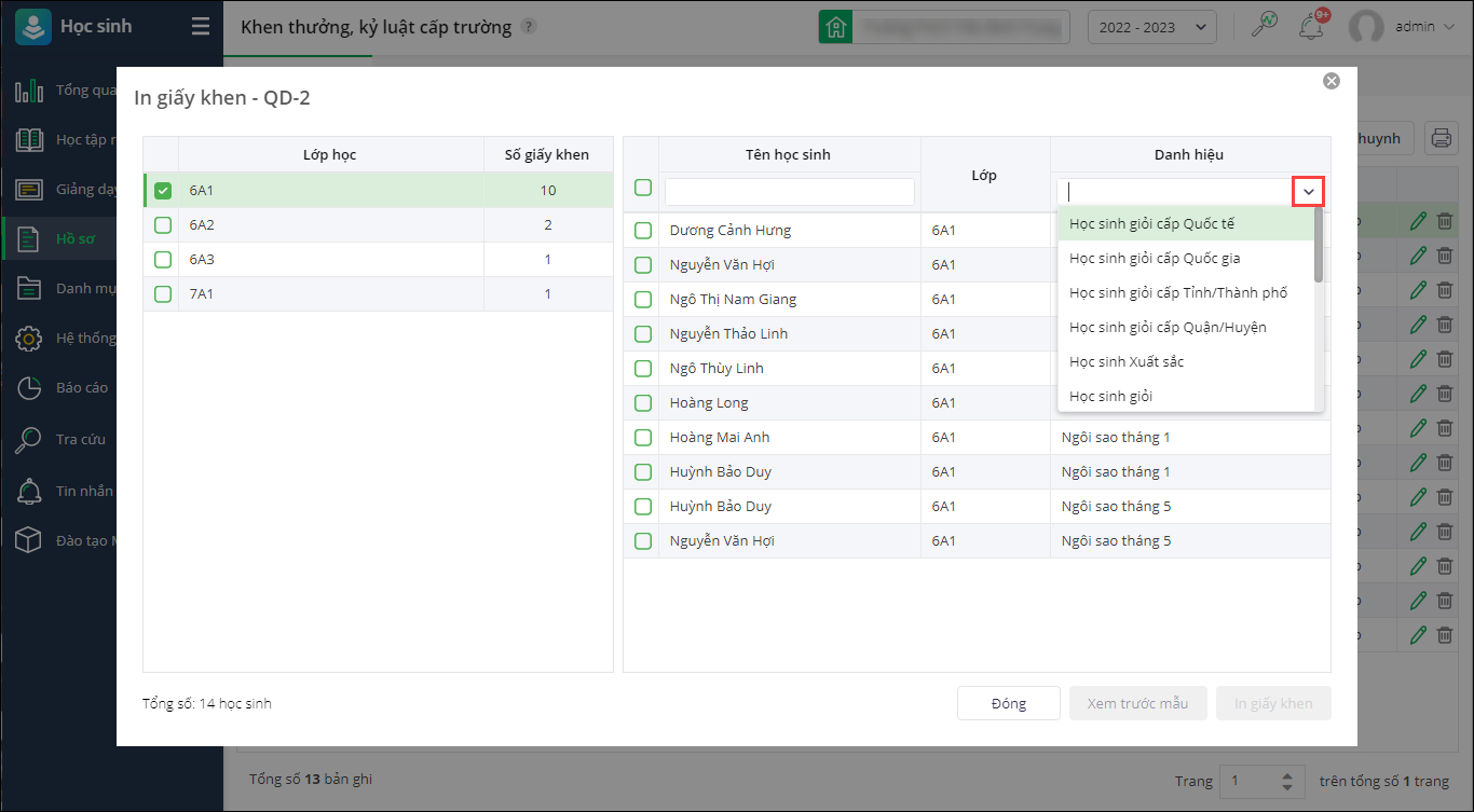 - Lọc nhanh danh sách được in giấy khen theo lớp học; danh hiệu hoặc tìm kiếm tên học sinh.