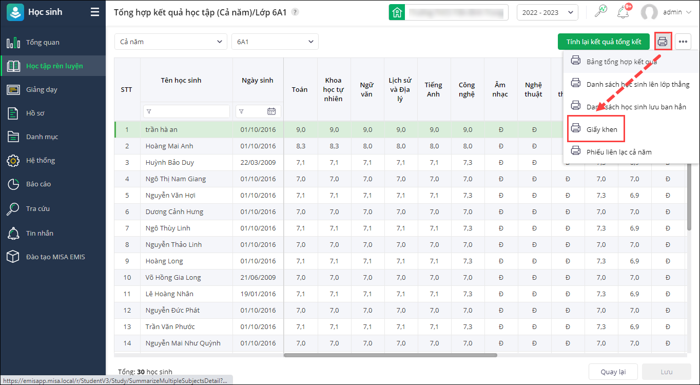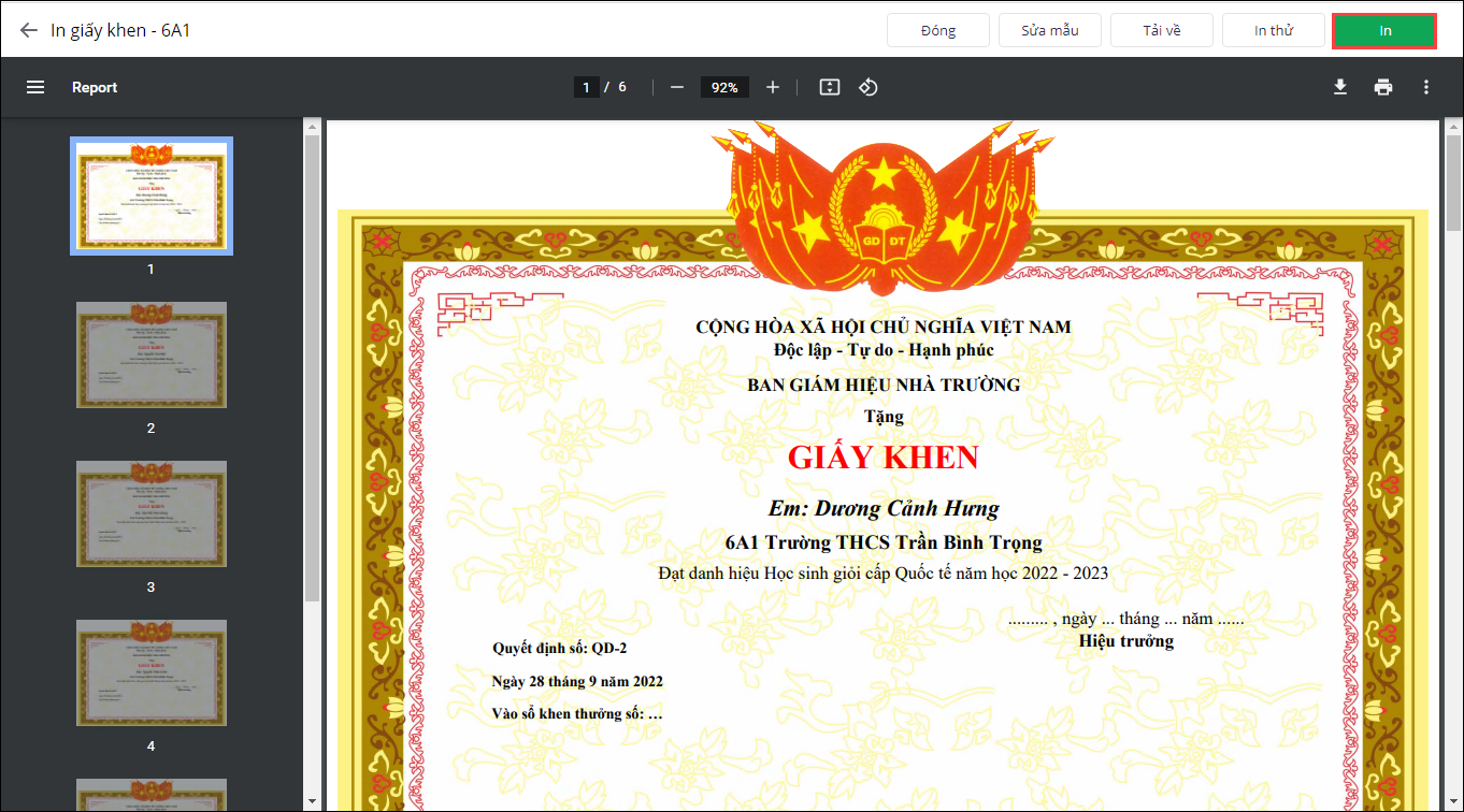 Sau khi có kết quả tổng kết định kỳ kết quả học tập của học sinh, giáo viên có thể in giấy khen cho học sinh của lớp như sau: