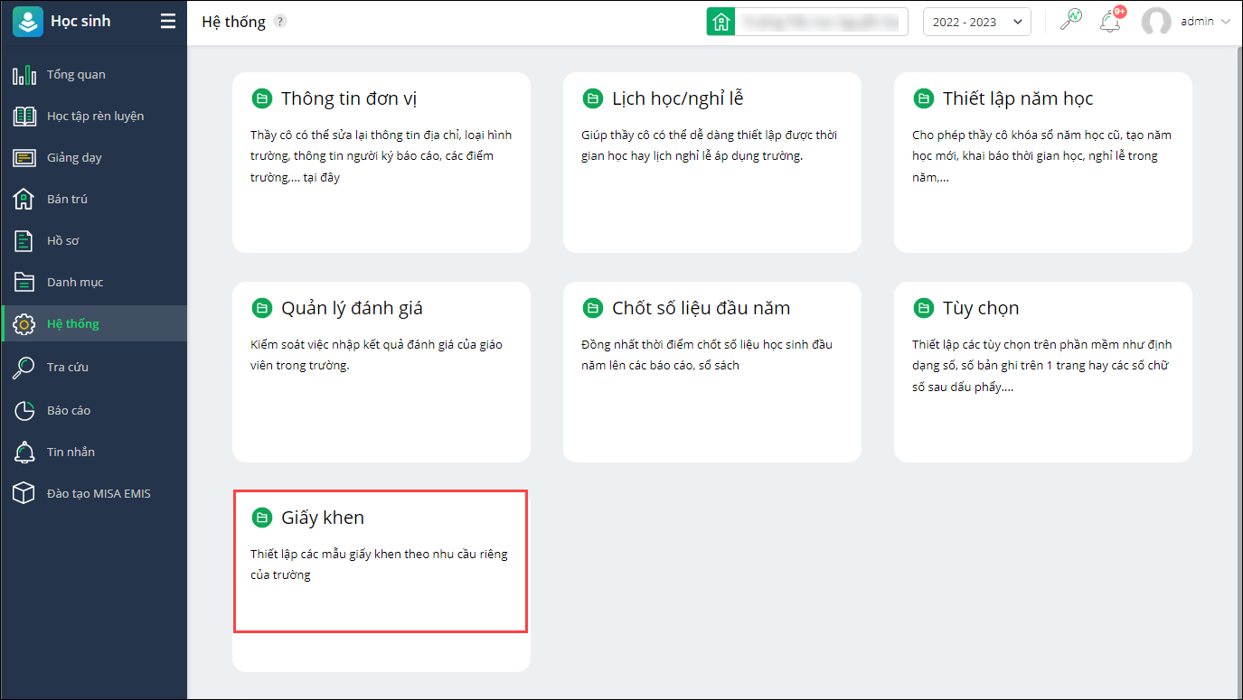 - Để bắt đầu in giấy khen tại đơn vị, anh/chị cần thiết lập mẫu giấy khen tại mục Hệ thống\Giấy khen.