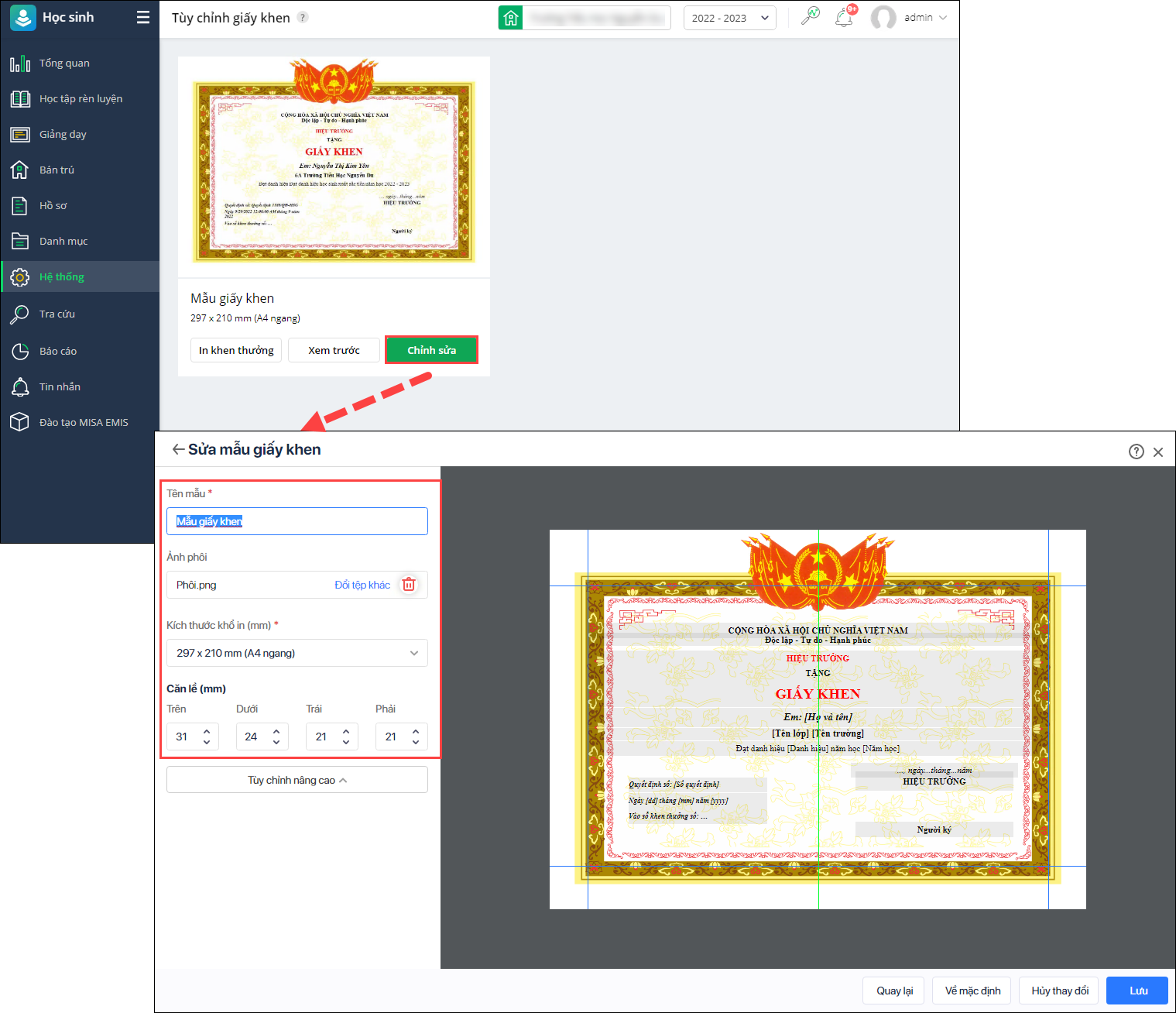 - Tại đây, phần mềm mặc định sẵn mẫu giấy khen để anh/chị tham khảo. Trường hợp mẫu chưa phù hợp, anh/chị có thể tùy chỉnh mẫu theo nhu cầu đơn vị bằng cách chọn Sửa mẫu.