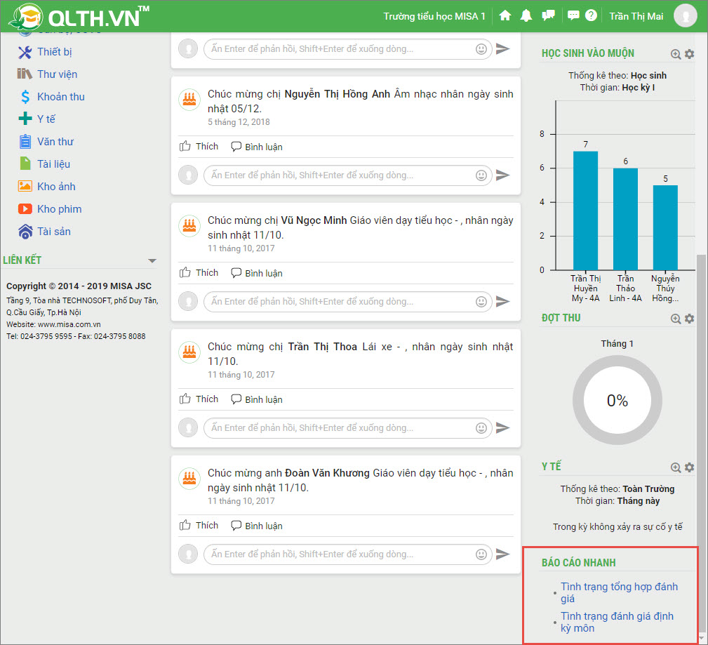 Lưu ý: Chỉ những tài khoản là admin, Hiệu trưởng hay giáo viên chủ nhiệm được mặc định xem được những thông tin báo cáo nhanh này. Trong trường hợp đơn vị muốn tài khoản khác cũng có thể xem được các báo cáo nhanh này thì anh/chị thực hiện phân quyền cho tài khoản đó theo hướng dẫn tại đây.