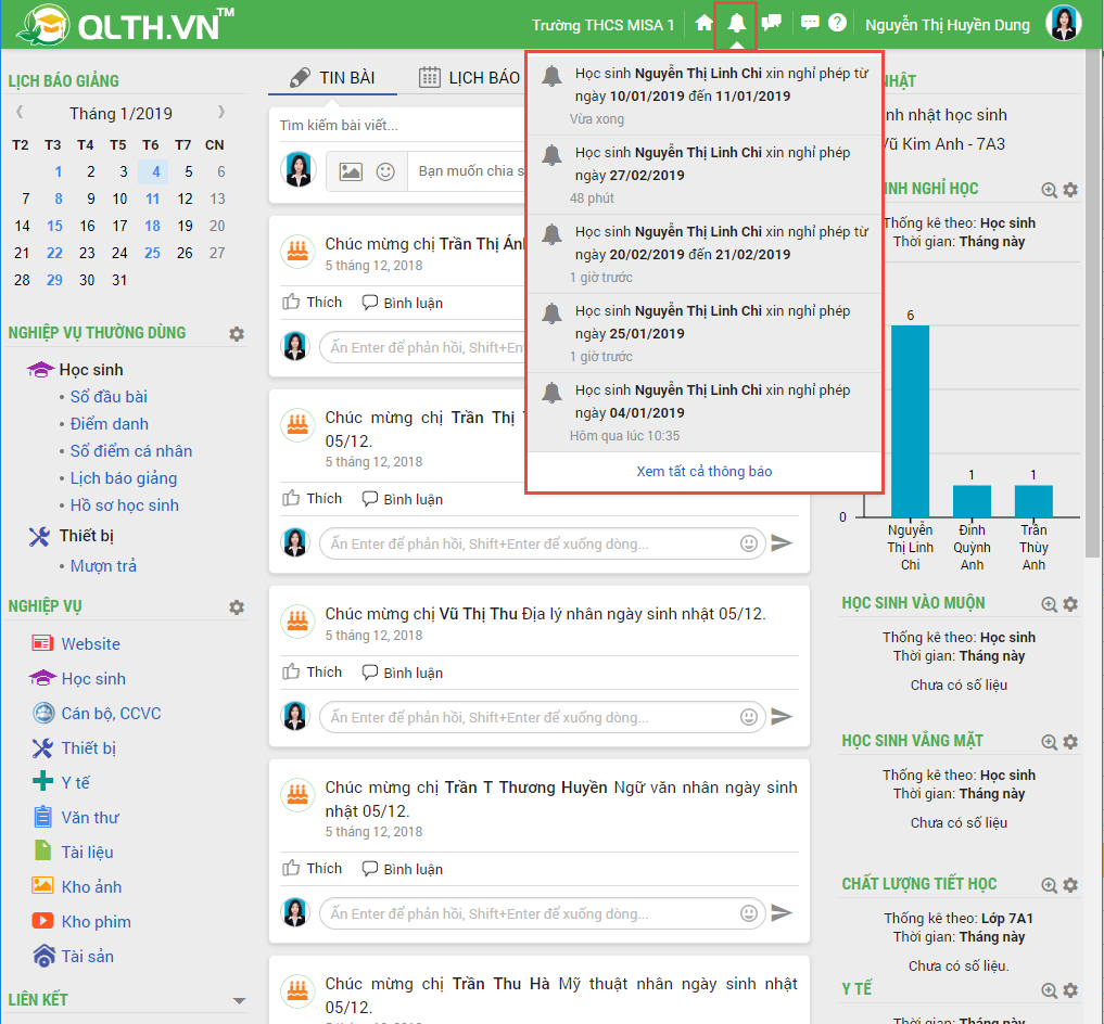 – Mỗi học sinh xin nghỉ tương ứng với 1 thông báo trên màn hình trang chủ của giáo viên.