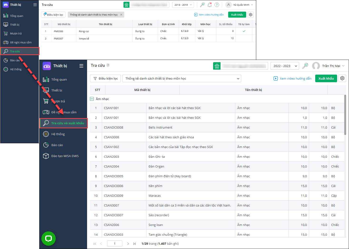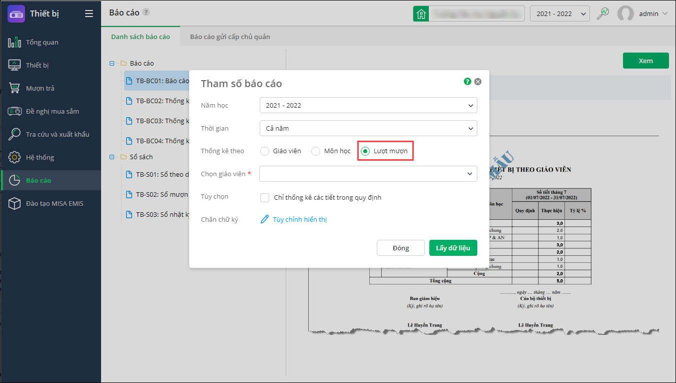 - Định kỳ cuối năm học, cuối học kỳ hoặc đột xuất theo yêu cầu của Ban Giám hiệu, cán bộ thiết bị cần báo cáo danh sách thiết bị theo tiêu chí.