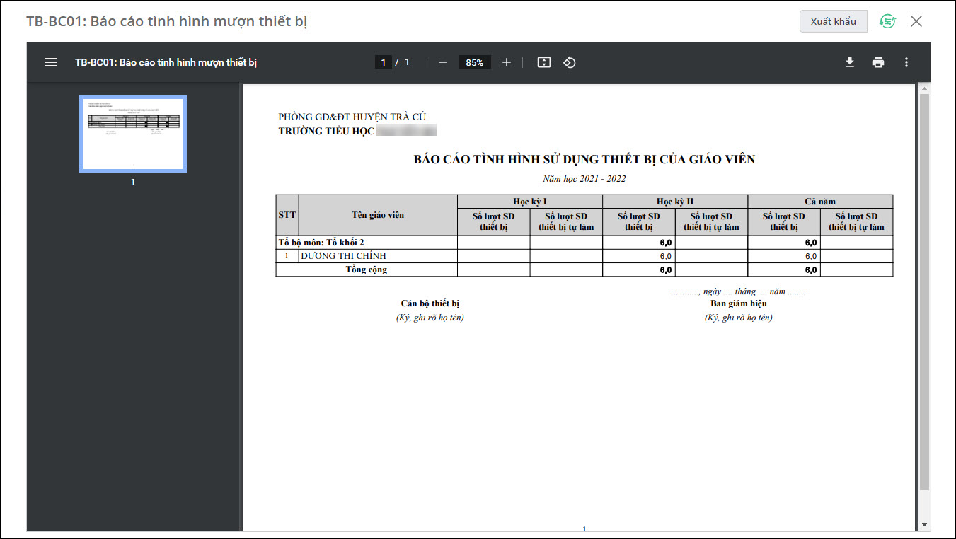 - Phần mềm cung cấp báo cáo thống kê tình hình mượn thiết bị của giáo viên theo số tiết nhưng chưa cung cấp báo cáo thống kê tình hình mượn thiết bị của giáo viên theo số lượt mượn.