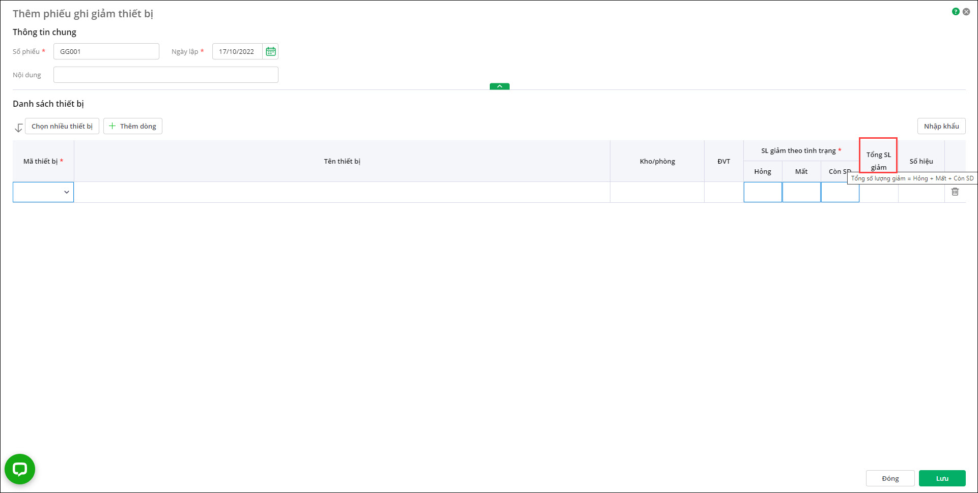 - Bổ sung hướng dẫn nhập: “Tổng SL giảm = Hỏng + Mất + Còn SD”