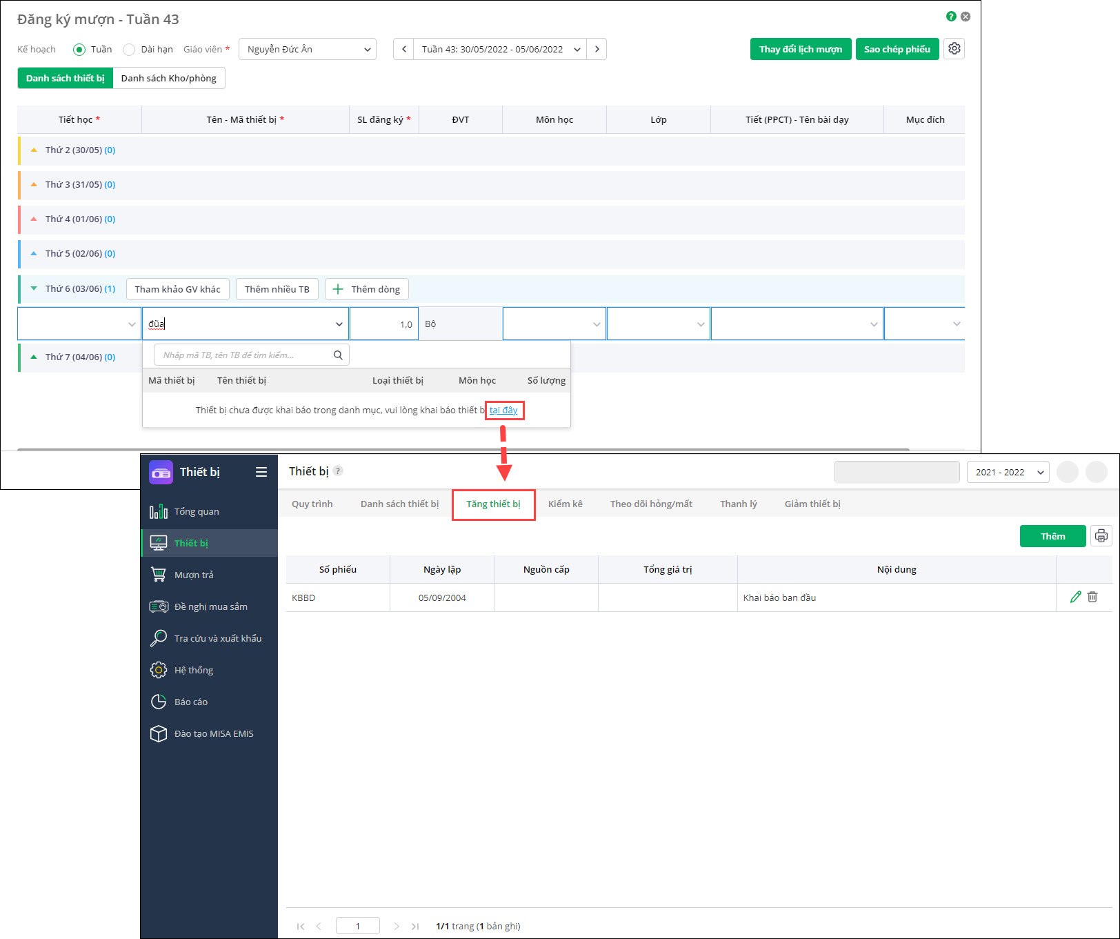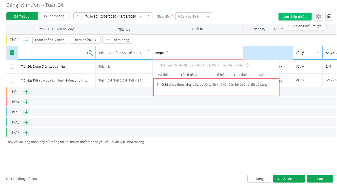 - Tuy nhiên nếu trong danh sách thiết bị chưa có thiết bị nào có tên như vậy, phần mềm không có cảnh báo gì và giáo viên bộ môn không thể chọn thiết bị.