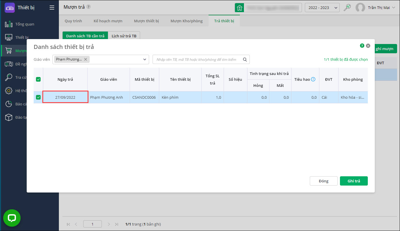 - Tại mục Mượn trả\Trả thiết bị\Danh sách thiết bị cần trả:
