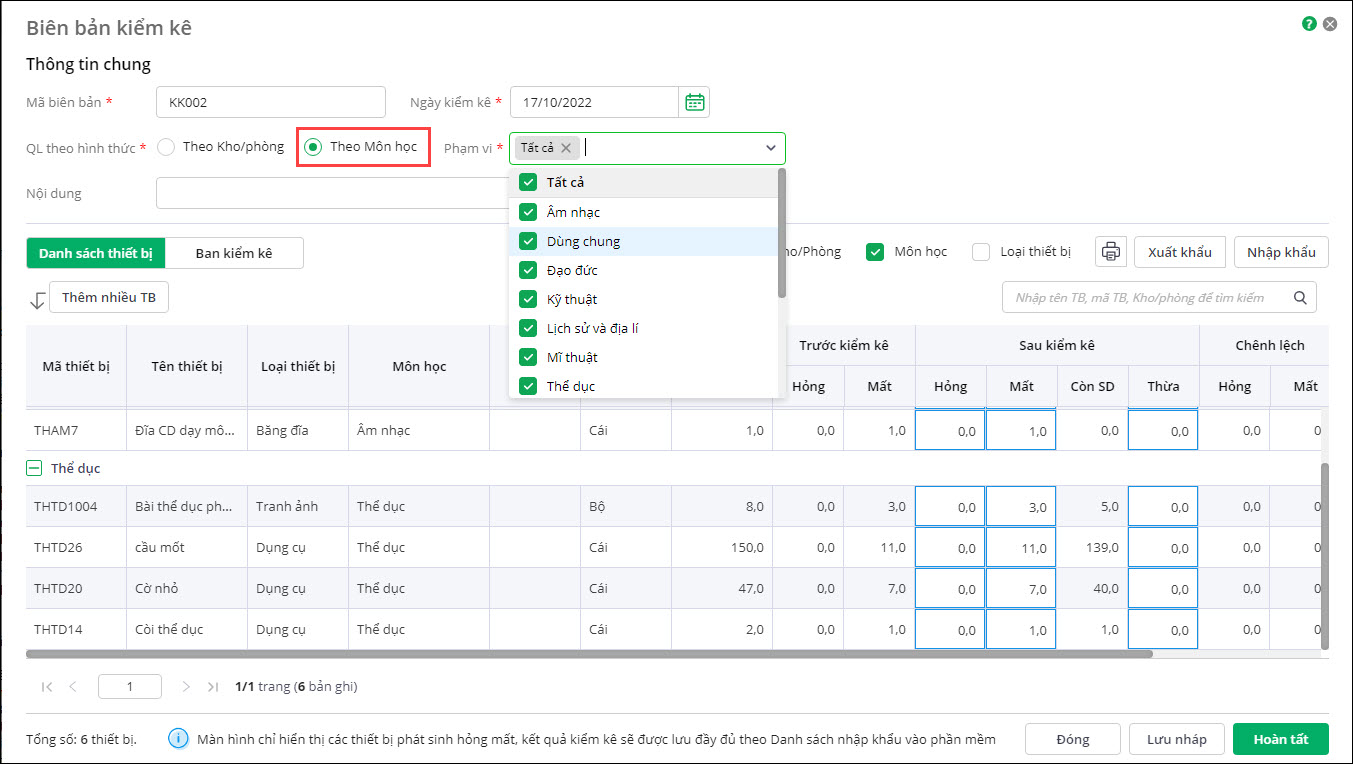 - Khi kiểm kê cho phép lựa chọn kiểm kê thiết bị theo kho/phòng hoặc môn học. Tuy nhiên khi kiểm kê theo môn học chỉ lấy các thiết bị được gắn theo môn học, thiết bị bỏ trống thông tin này không được lấy lên để kiểm kê.