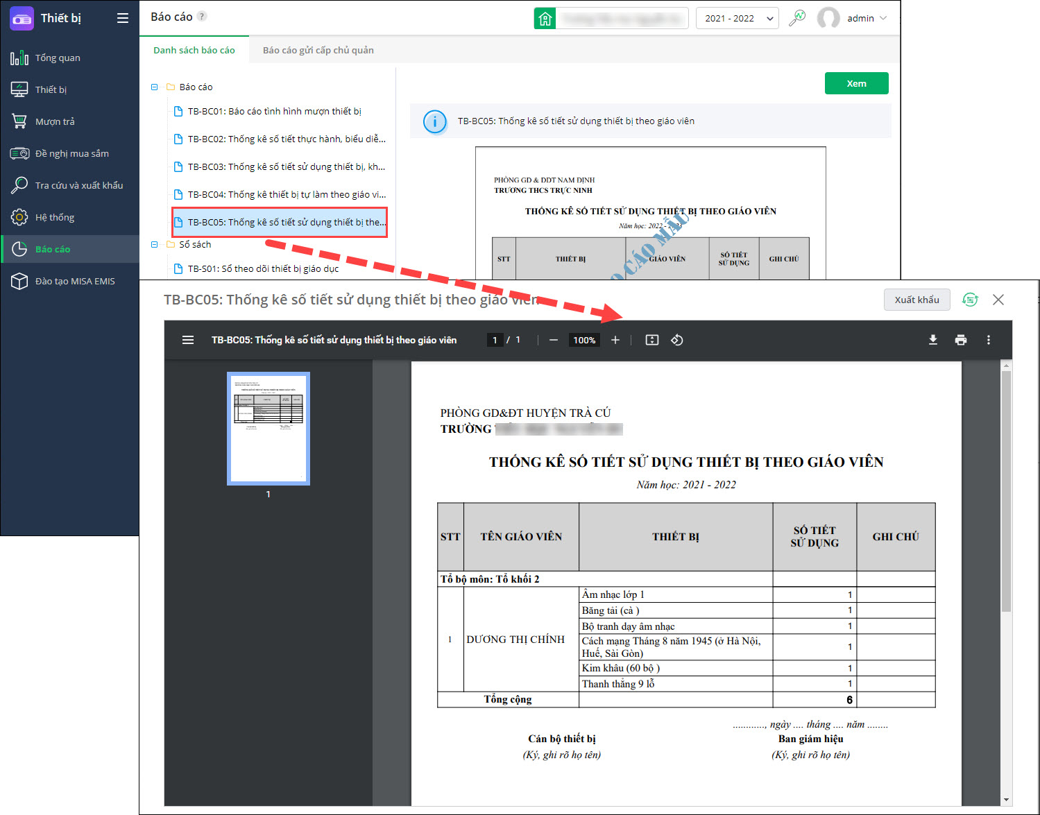 - Bổ sung mẫu báo cáo TB-BC05: Thống kê số tiết sử dụng thiết bị theo giáo viên. Xem hướng dẫn chi tiết tại đây.