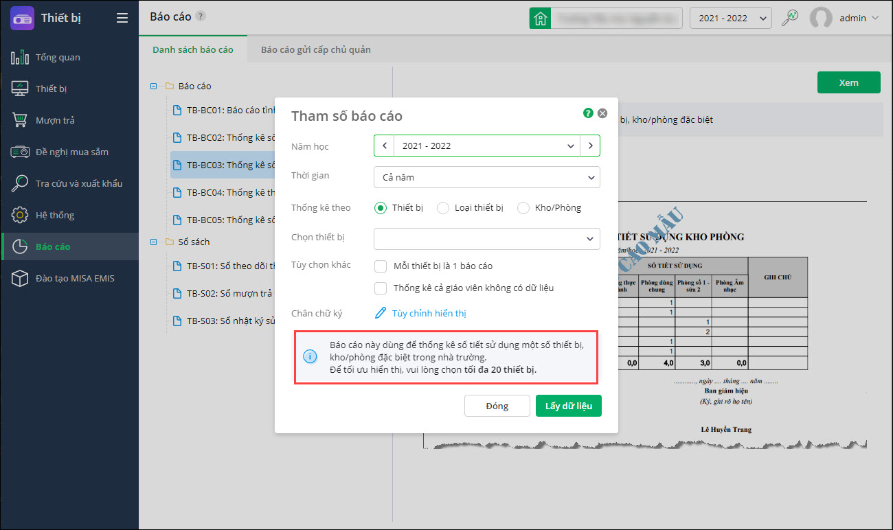 - Đối với báo cáo TB-BC03: Thống kê số tiết sử dụng thiết bị, kho/phòng.