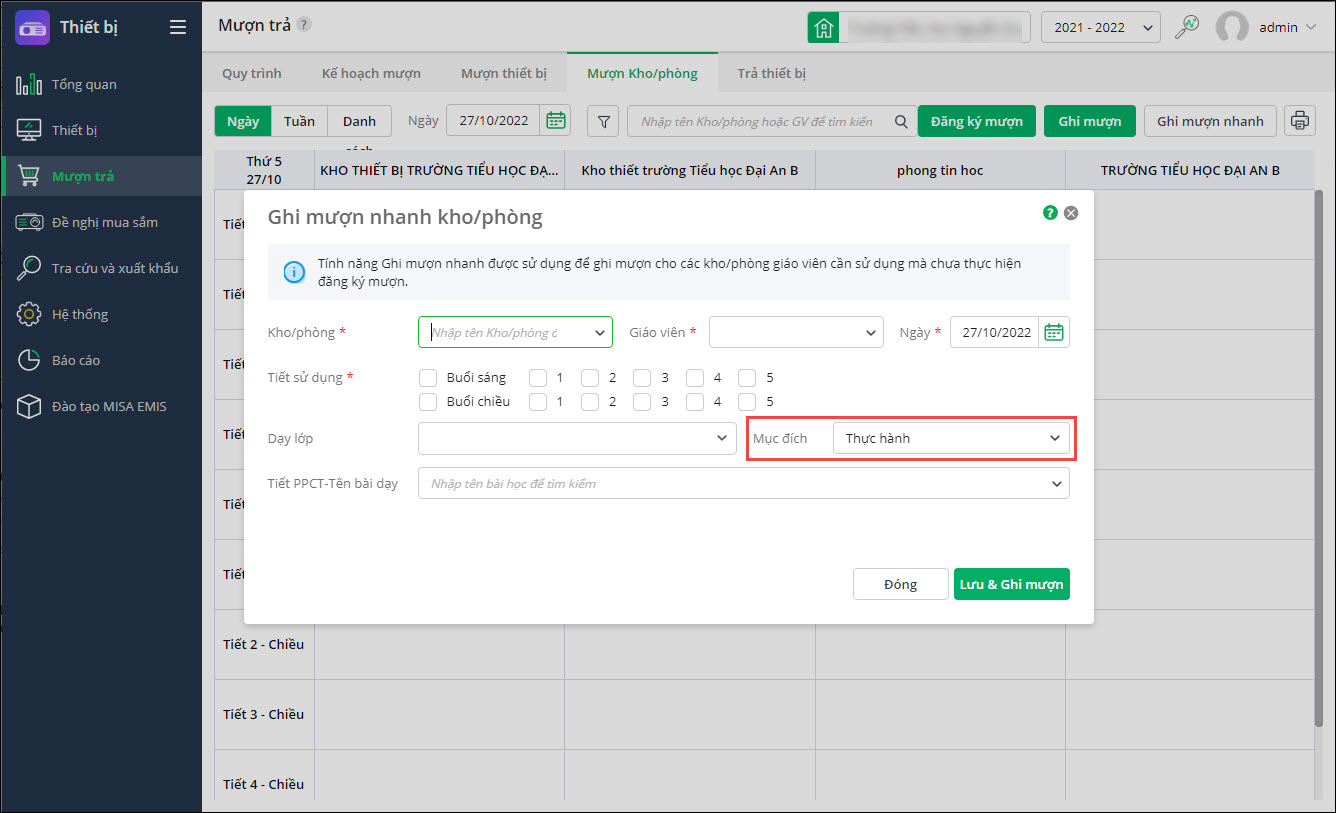 1. Cán bộ thiết bị mong muốn khi mượn kho/phòng có thể khai báo mục đích sử dụng để dễ dàng thống kê số tiết thực hành, biểu diễn sử dụng phòng bộ môn