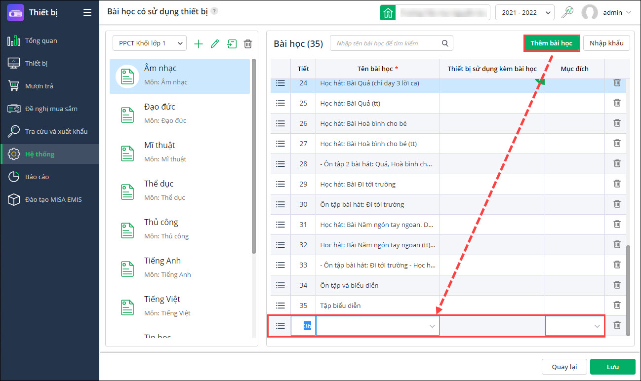 - Tại mục Hệ thống\Bài học sử dụng thiết bị: Khi người dùng tự Thêm bài học, vẫn tự động sinh với số tiết là số liền sau liên tiếp với tiết lớn nhất trên danh sách.