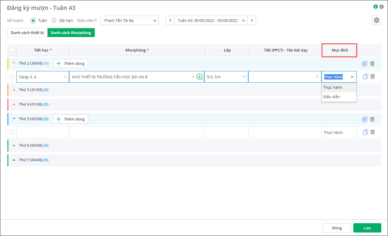- Giáo viên có thể khai báo thông tin về: tiết học, kho phòng muốn mượn, danh sách thiết bị mượn kèm, môn học, lớp dạy và tên bài học (PPCT). Tuy nhiên chưa thể khai báo mục đích sử dụng kho/phòng.